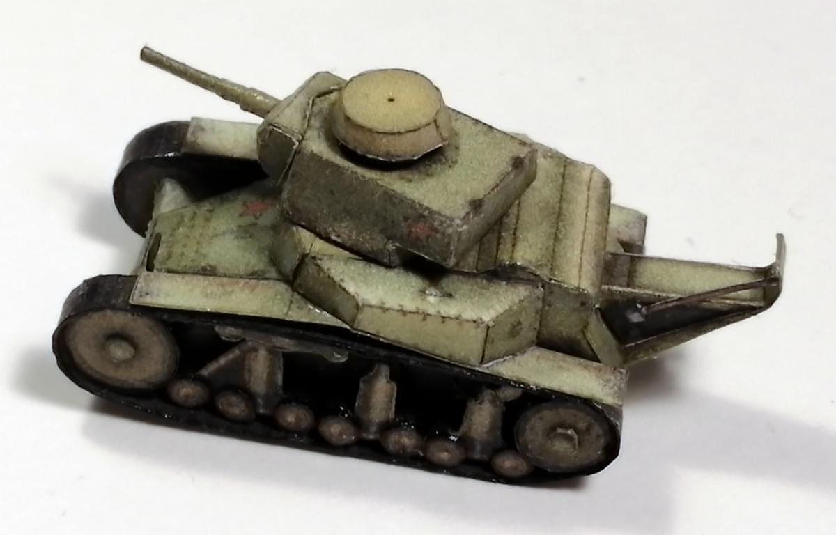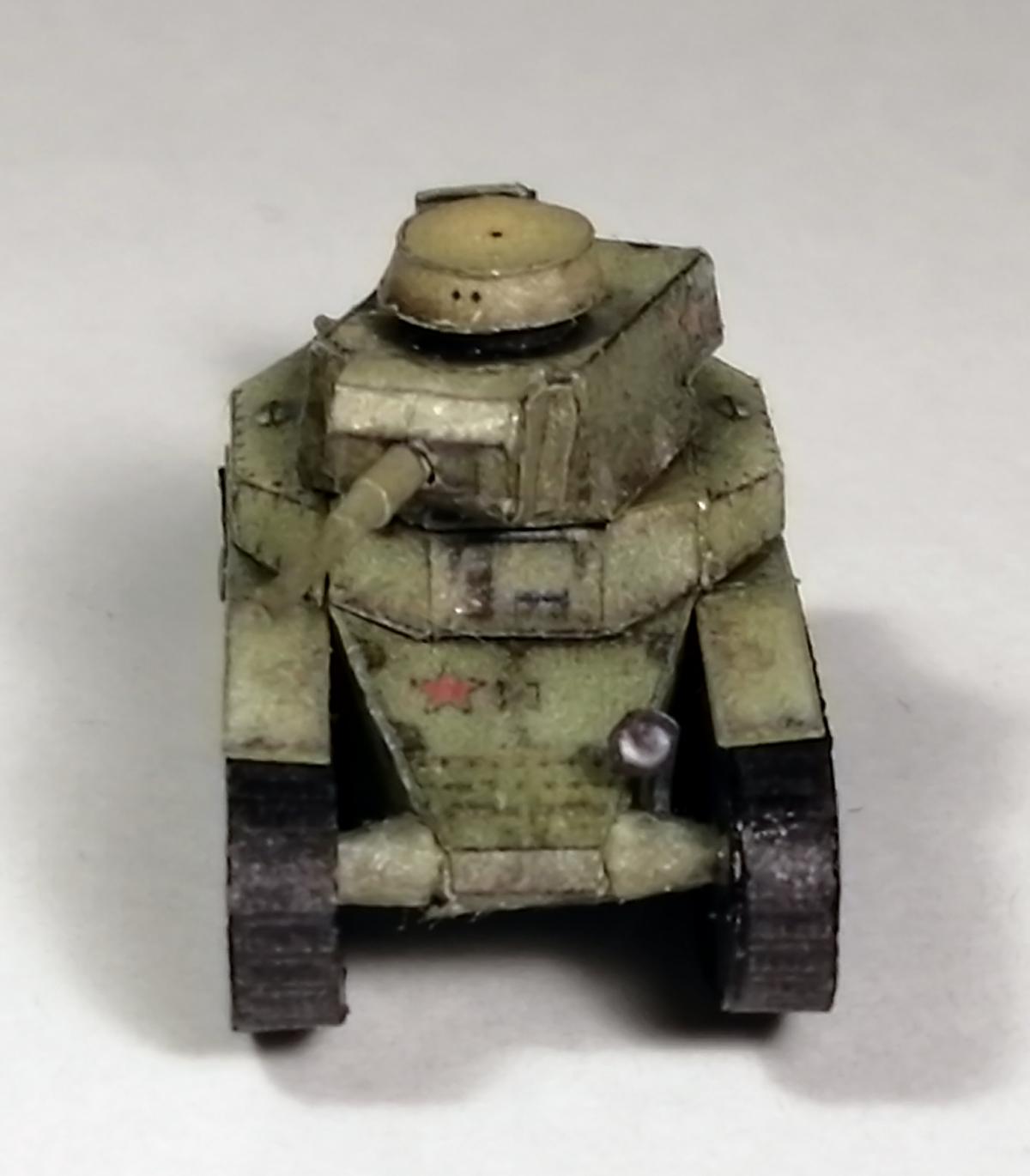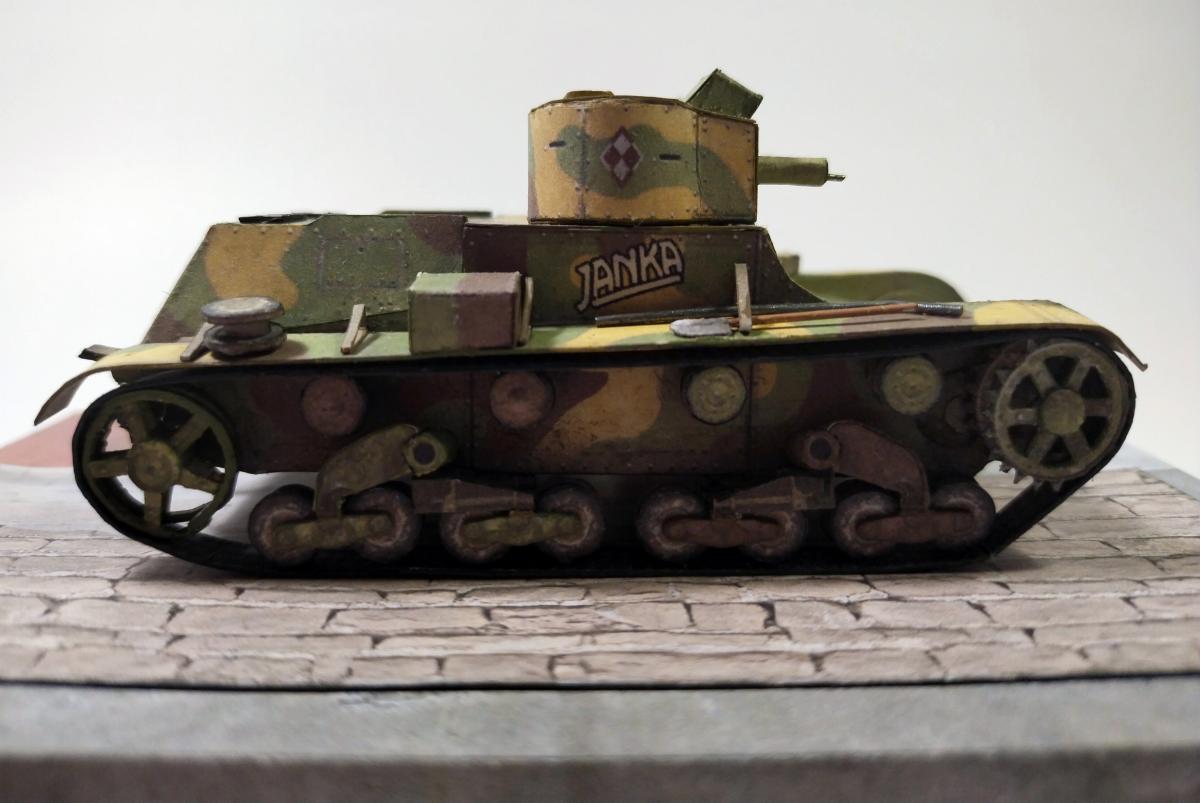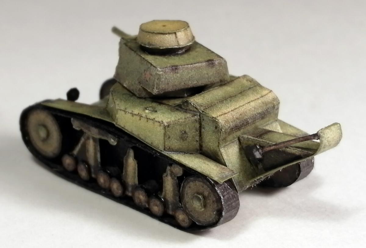 Приветствую. Посмотрел работы perepe4atnikov-а, и меня сразу заинтересовало: смогу ли я собрать модель,длиной не более 5 см. В итоге получилось что получилось. Это был мой первый опыт применения лака на бумажных моделях (скорее всего и последний), лак образует небольшие ворсинки, в некоторых местах образовались небольшие, но неуместные блестящие пятна. Косяк также в неуместно блестящей ходовой (перед обработкой лаком её стоило замаскировать, о чём я не подумал). также фото для понимания размера модели: P.S. линейка в миллиметрах.
