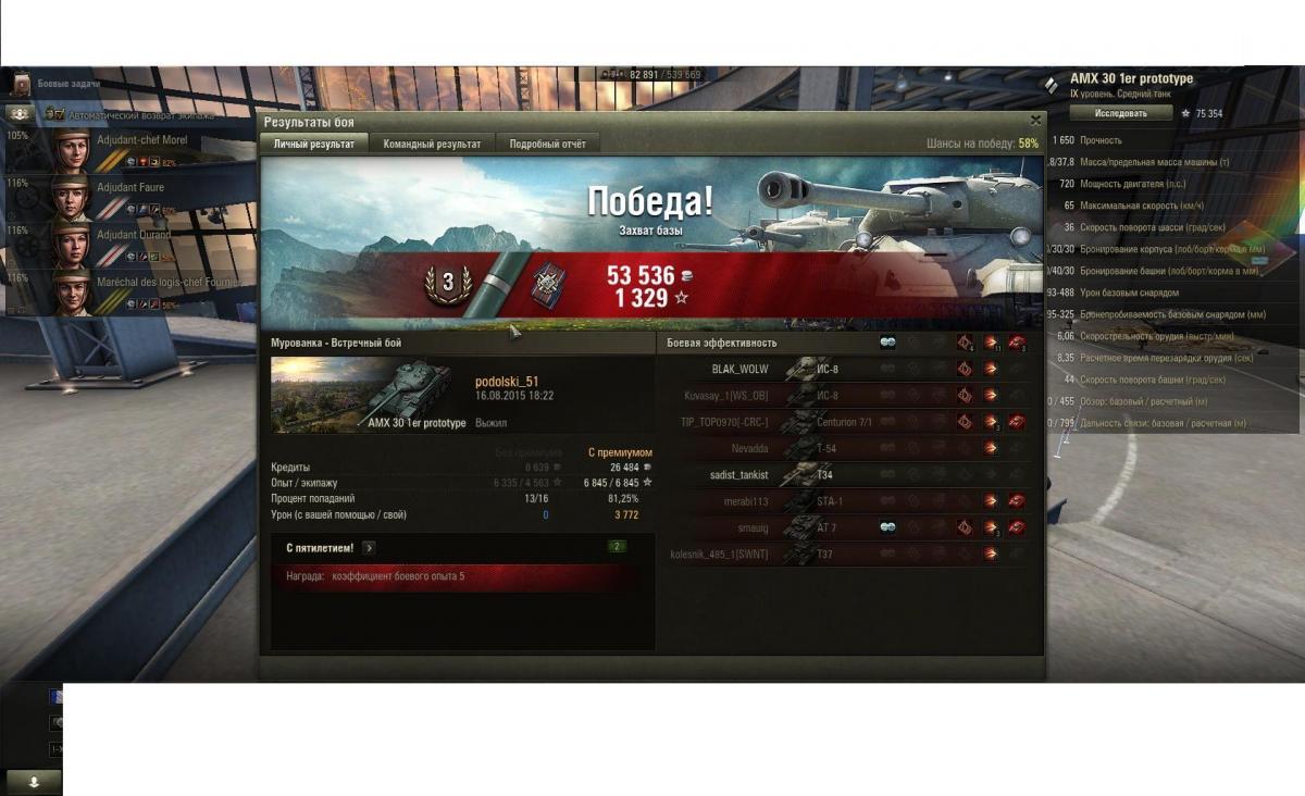Отыграв 110 боев, получил первую отметку.Самый главный плюс этого танка это топовая пушка,шьет все и вся,притом ,что это танк 9 уровня.Экипаж посадил женский ,с открытым братством,из допов поставил досылатель,стаб,вентиль.Перезарядка 8.17 без крепкого кофе,с 7.83.Обзор 444 метра,перклы пока качаются. ИМХО лучший средний танк 9 уровня,который не уступает многим ст 10 уровня.Думаю в ближайших обновлениях понерфят.Если ничего не изменится AMX 30 B покупать не буду.