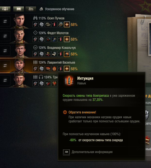 1. У меня данный перк изучен на 100%. По описанию перка время смены типа снаряда должно уменьшиться на 60% при полном изучении, но показывает 37,35%. И в игре время смены 6,7с при времени перезаряда 10,7с. В чём может быть дело?