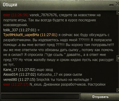 столкнулась сегодня в бою со взводом местных "нагибаторв" ,которым главное фраги и остальное не колышет !!! Подумаете зачем пишу ? да чёт просто возмущение переполняет и удивление как такое хамло ещё создало клан какой-то и управляет им... Взвод был на нашей стороне, состоял он из командира клана "Золотые руки "__Tanushka36rus__ и её помощника . Ком женского рода простояла в кустах весь бой добирая шотиков, по концовке полетела за последними двумя уже смело , взяла 7 фрагов и чтобы не дать мне забрать 8-го , просто попросила своего совзводного,чтобы тот меня убил. Ну это *** долго не думало и с одного выстрела за брал у меня всё хп. на мои громкие возмущения , она попыталась сначала оправдаться тем,что лбз мол,а затем просто раскрылась по полной в матах. Я вот не понимаю, почему для командиров кланов нет никаких наказаний ? Вот объясните мне , они вроде как примером должны быть ,а в итоге они творят что хотят и безнаказанны!!! Может кончено моё письмо и не по адресу, но не важно, пусть люди знают к кому идут в дальнейшем !