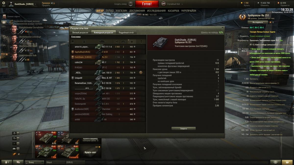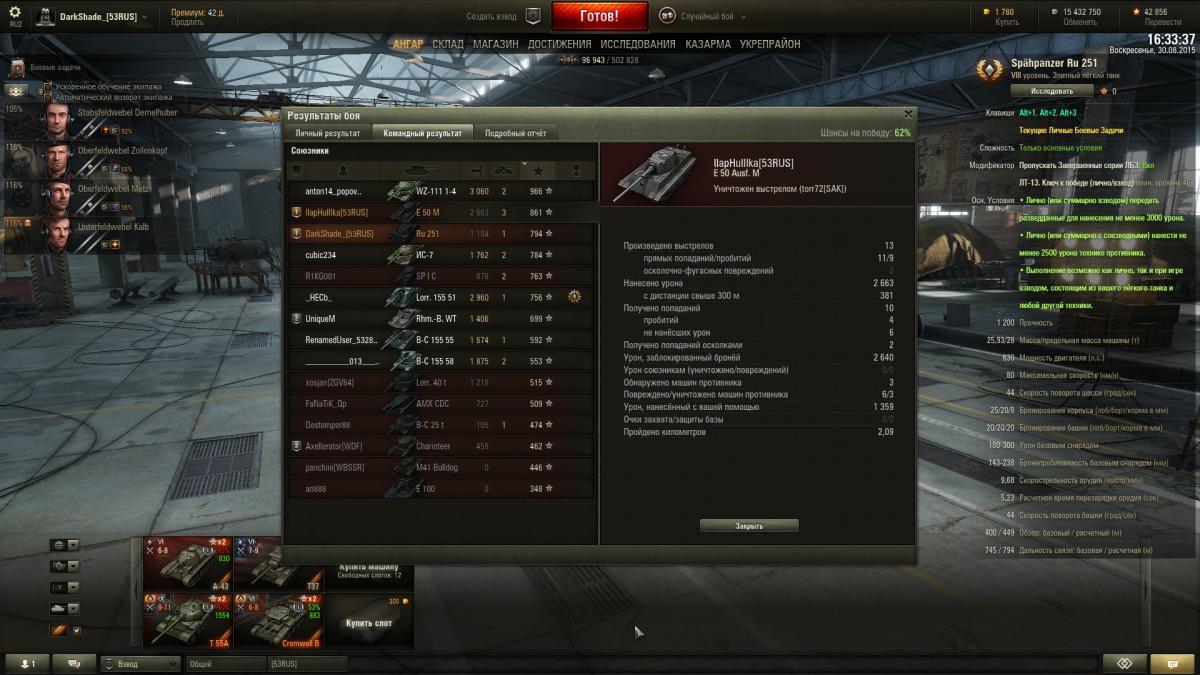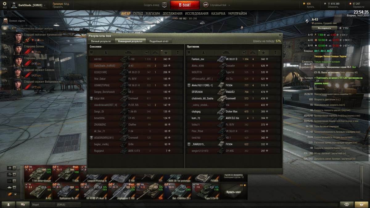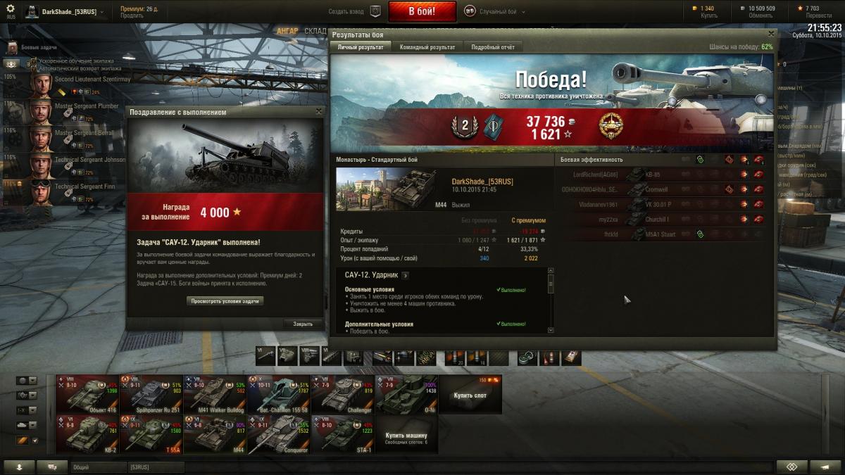 Ура! Наконец то выполнил последнюю 15 задачу за Альянс! Катал неделями не сильно напрягаясь, и вот захожу в бой и говорю "Бог ВБРа дай мне удачи,точности и возможность оказаться в нужном месте и в нужное время, и не поверите затащил бой, даже с отличием! Совпадение или нет, но я знатно офигел Взял наконец таки Химеру в свой ангар! Объекта 279 (р) врятли возьму, но буду пробовать. Желаю всем удачи!