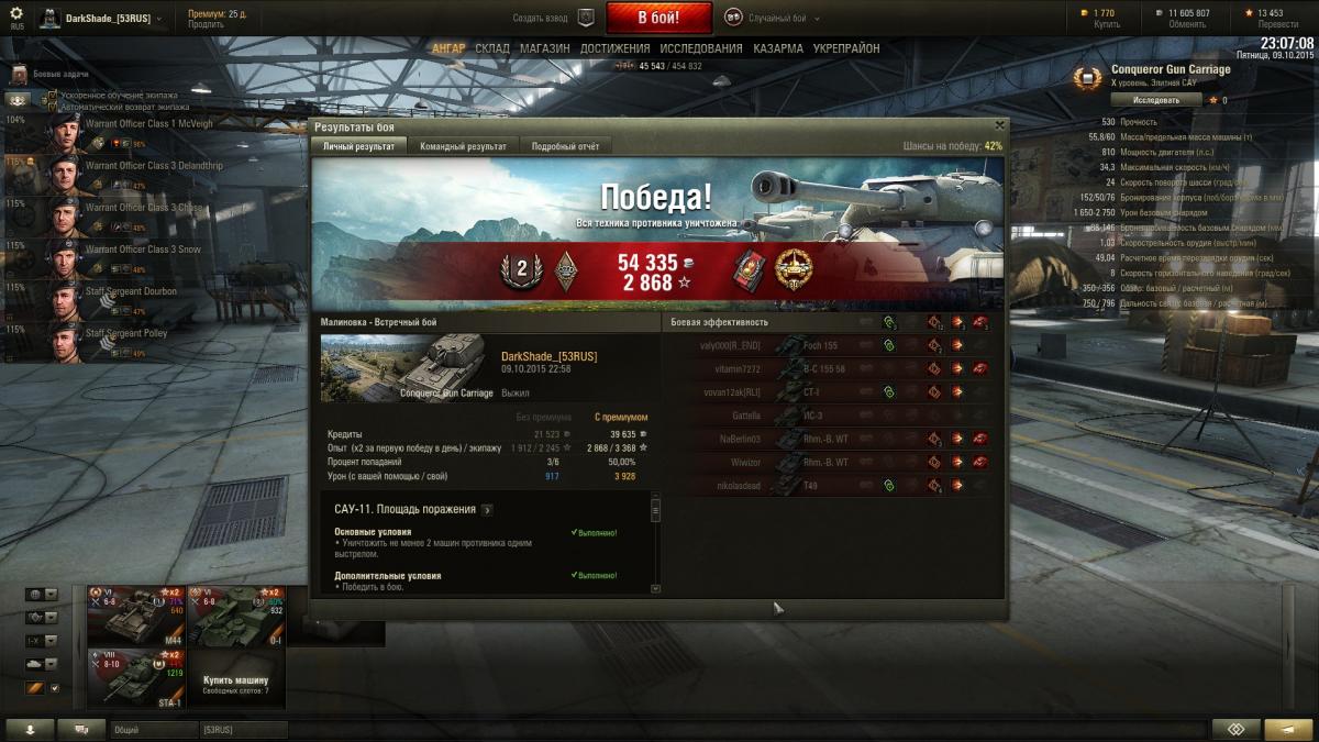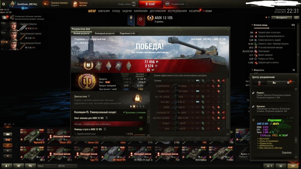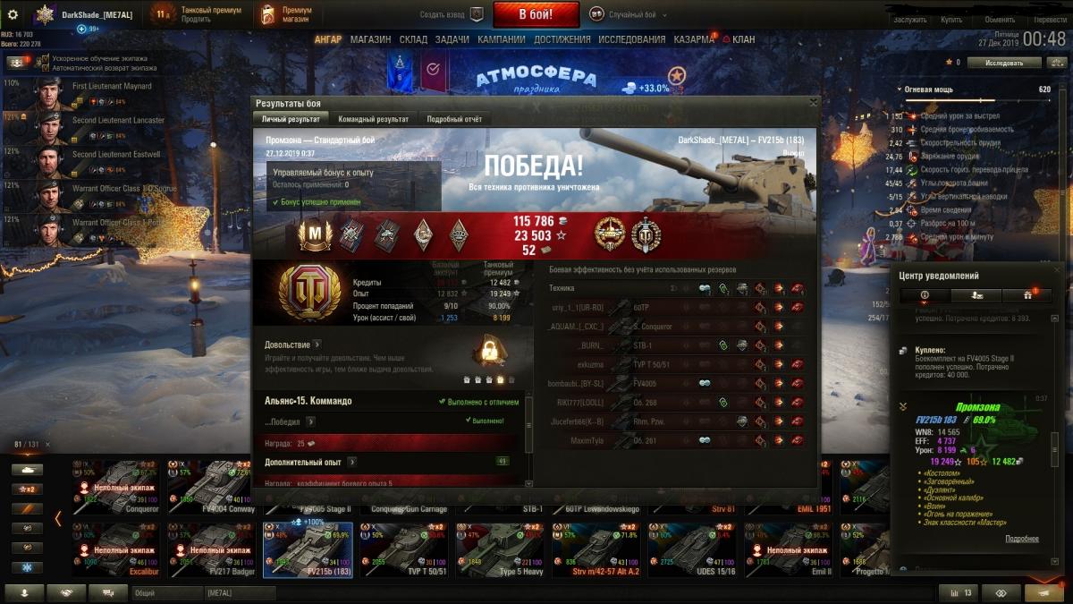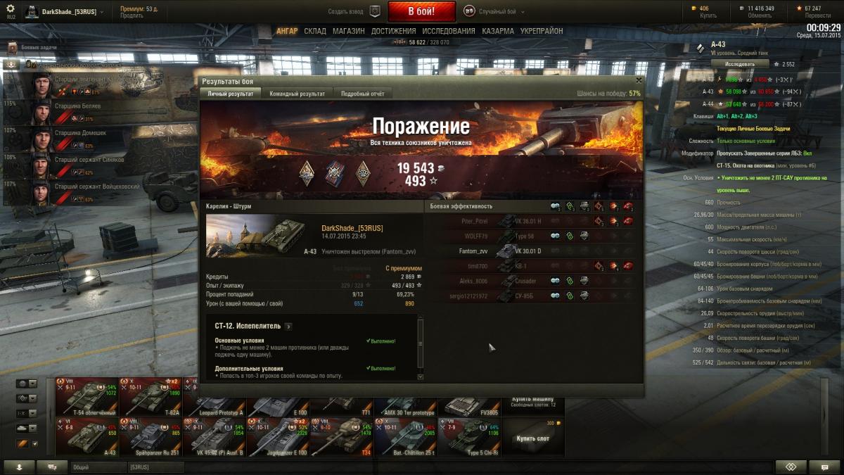 Ура! Наконец то выполнил последнюю 15 задачу за Альянс! Катал неделями не сильно напрягаясь, и вот захожу в бой и говорю "Бог ВБРа дай мне удачи,точности и возможность оказаться в нужном месте и в нужное время, и не поверите затащил бой, даже с отличием! Совпадение или нет, но я знатно офигел Взял наконец таки Химеру в свой ангар! Объекта 279 (р) врятли возьму, но буду пробовать. Желаю всем удачи!