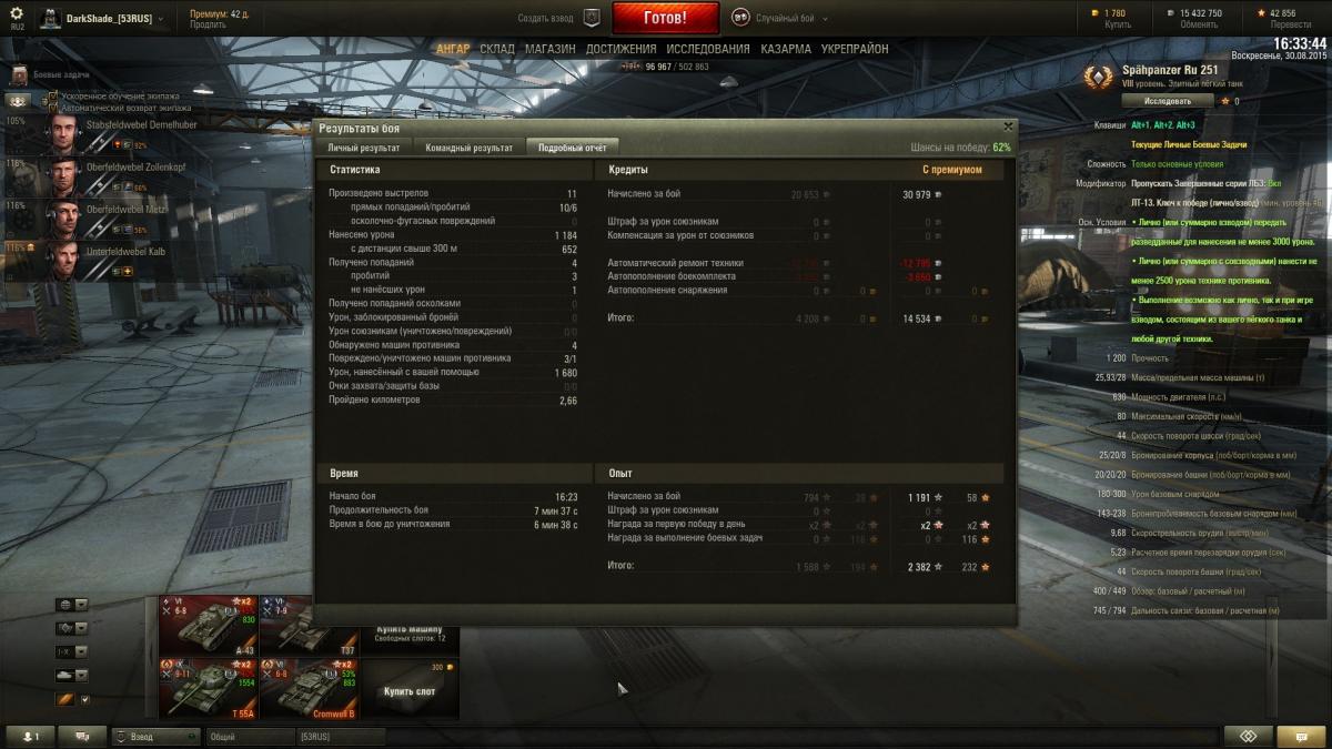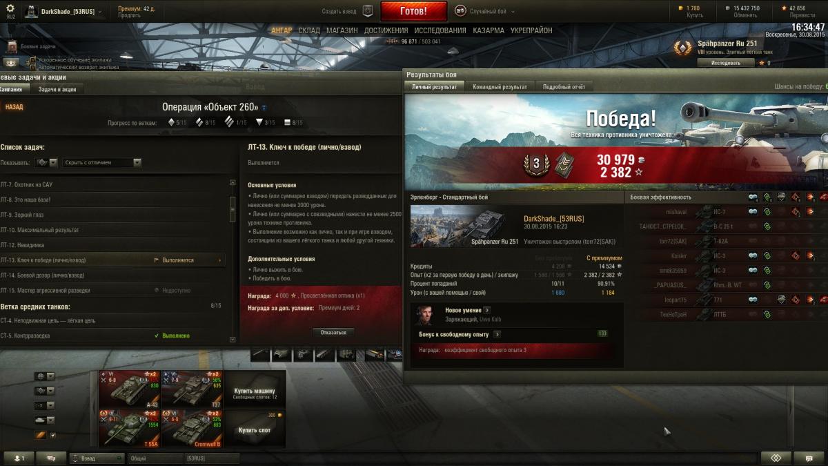 Ну вот и мне повезло с задачей лт-15 http://cdn-frm-eu.wargaming.net/4.4/style_emoticons/wot/Smile_glasses.gif Сделал на Ру 251, на прохоровке. Стоял на аллее в кусте с трубой, под конец боя рванул к их базе, в итоге 8400 засвет. Задача конечно на удачу, на выпадение нужной карты (прохоровки, огненной дуги, малиновки), на других картах тоже есть возможность насветить, ну она очень мала и почти невыполнима. Желаю всем удачи и терпения! Ушел мучить об.260 http://cdn-frm-eu.wargaming.net/4.4/style_emoticons/wot/Smile-izmena.gif