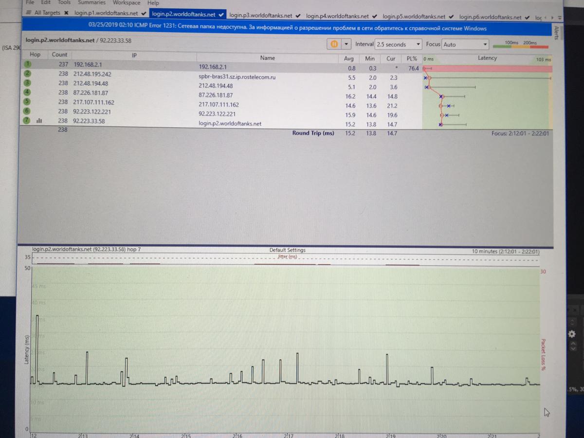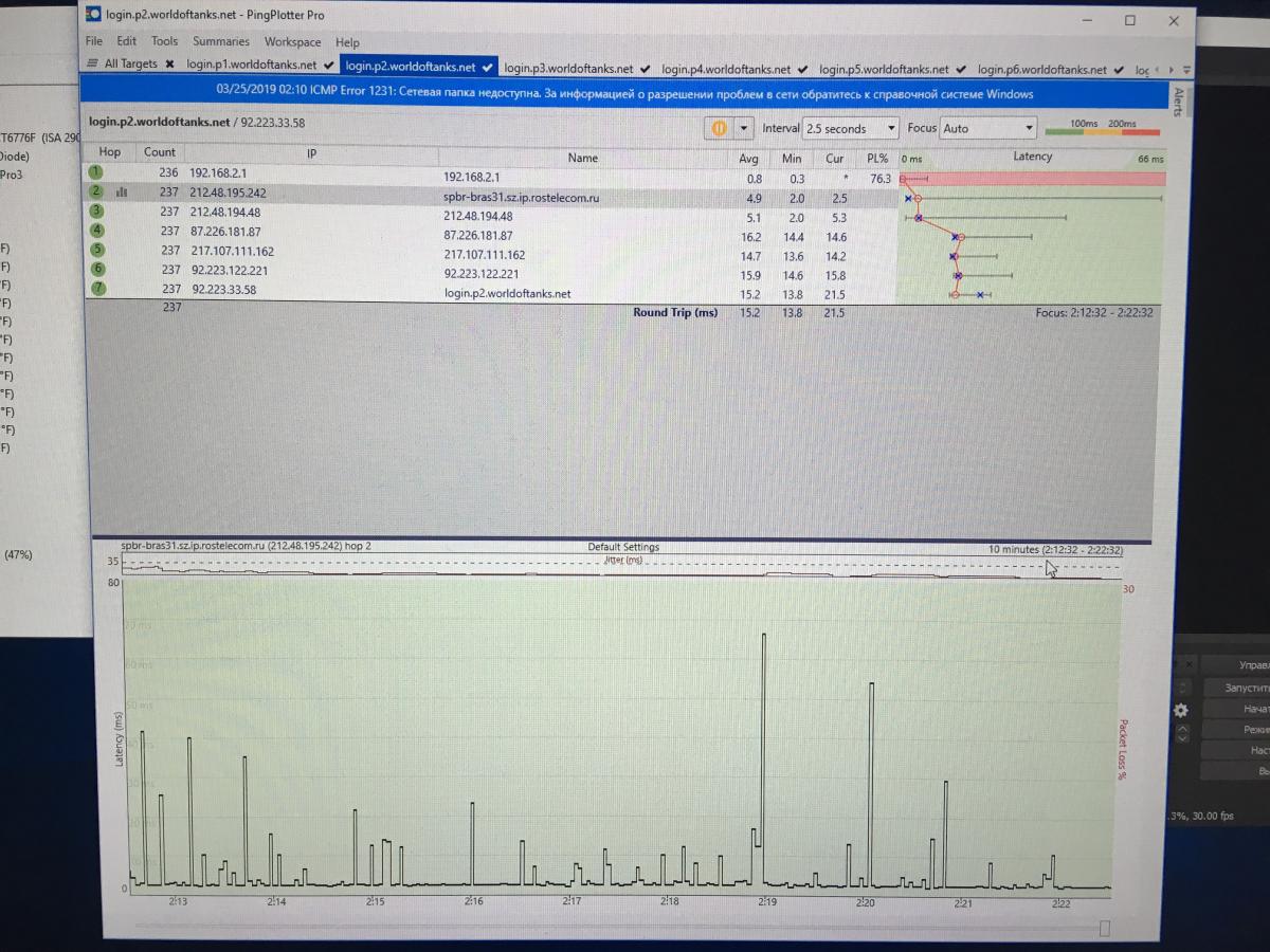 http://cdn-frm-eu.wargaming.net/4.5/style_images/wg/snapback.pngnaHuka_B_ropoge (22 Мар 2019 - 15:47) писал: У вас wgc стоит вам нужно сделать так http://cdn-frm-eu.wargaming.net/wot/ru/uploads/monthly_02_2019/post-4613571-0-19968600-1550604349_thumb.png Как прикрепить файл к посту? и отчет о трассировке программой PingPlotter (инструкция) Так же отчет Аида64. "Восстановить игру" - пробовал, не помогает. Я за эти две недели раз 15 уже переустановил игру на разные диски (два SSD и один HDD), на разные версии Виндовс и с модами и без и в SD и в HD и настройки выкручивал во всех проекциях - ничего не влияет на проблему. Запуск стрима на данный баг не влияет никак и с ним и без него он присутствует. Перепробовал все версии драйверов. Собрал второй ПК на другом железе - накатил на него всё с нуля.. проблема сохраняется. Разные мониторы пробовал, разные видеокарты тоже. Начал уже грешить на провайдера (Ростелеком), запустил ПингПлоттер, но и в нём.. вроде бы как всё ровно, не разобрался как там сделать отчёт - сделал несколько фото, прикрепляю (самый высокий скачок был до 75мс), мониторил играя 30 минут примерно - фризы от показаний графика вроде бы как не имеют зависимости. Да и ранее, недели 2 назад, не было таких проблем, а провайдер был тот же. Нагуглил в выходные у людей аналогичную проблему при открытых вкладках определённых в браузере - завершал все процессы всех браузеров, не помогло. Ещё нашёл один ролик с аналогичной проблемой и предположением зависимости от количества работающих ядер, была версия у человека, что фризы могут быть в момент активации всех ядер при резком повышении нагрузок, есть софтина специальная - тоже не помогло. Записал видео с возникающей проблемой, вот ссылка.. сработал "эффект белого халата" и не столь мощными кажутся фризы, но бывают значительно более мощные и идущие подряд. Время (есть в комментах под видео), где наиболее заметны фризы 3:55, 6:43, 7:22, 10:11, 12:24, 13:43, 13:46, 16:17, 16:49. WGCheck - тоже прогонял, проблем не выявил, отчёт прикрепляю. На реалиях данную проблему не видно кстати. Создал обращение в ЦП с описанием всех симптомов и со ссылкой на эту тему. Жду ответ. Есть ли у кого ещё идеи в чём может быть причина? Сейчас стою в шаге от перехода с Ростелеком на другого провайдера.. т.к. я уже представить не могу - в чём проблема, остаётся два варианта по сути - либо провайдер, либо на стороне WG проблема (кривое обновление или оптимизация). Всё остальное уже перепробовано. WoT_report.wgc