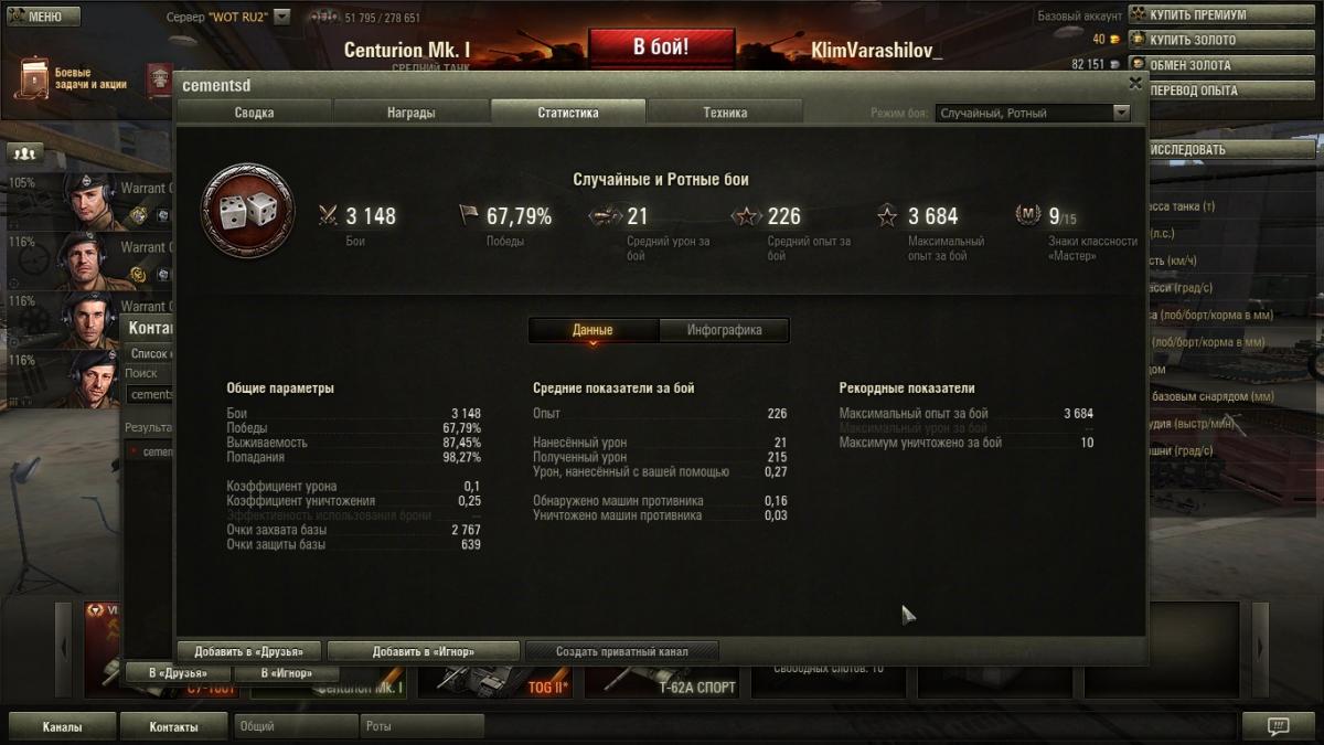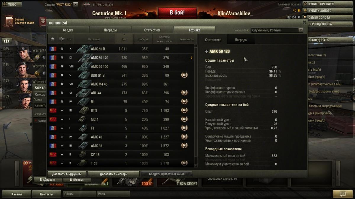 Доброго времени суток Через сайт wot news посмотрел лучших игроков на амх 50 120 http://worldoftanks.ru/community/accounts/20026452-cementsd/(но сейчас посмотреть не возможно). Просто я недавно купил его первые 30 боёв примерно процент побед колебался от 53 до 55 % но сейчас 63 боя и 43 % средний урон 1200 вон из кожи лезу помогаю команде и такая награда а этот "уникум" нифига не делая имеет стату 96 % на нём . Просто удивляет.