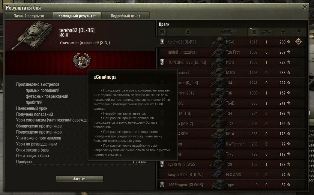 Здравствуйте! После очередного боя решил взглянуть на послебоевую статистику и не понял почему достижение в бою "Снайпер" получил не я, а игрок из противоположной команды. http://cdn-frm-eu.wargaming.net/wot/ru/uploads/monthly_02_2013/post-253281-0-56989300-1361540759_thumb.jpg Несколько раз всё перепроверив и внимательно прочитав требования для получения данной награды, и исключения к ней, решил посоветоваться с вами. http://cdn-frm-eu.wargaming.net/wot/ru/uploads/monthly_02_2013/post-253281-0-61044900-1361540778_thumb.jpg Вот развёрнутая послебоевая статистика, из которой следует, что "Снайпера" должен был получить я, а не товарищ из противоположной команды. http://cdn-frm-eu.wargaming.net/wot/ru/uploads/monthly_02_2013/post-253281-0-16206600-1361540773_thumb.jpg http://cdn-frm-eu.wargaming.net/wot/ru/uploads/monthly_02_2013/post-253281-0-61137300-1361540766_thumb.jpg Если я не прав, то, пожалуйста, поправьте меня :)