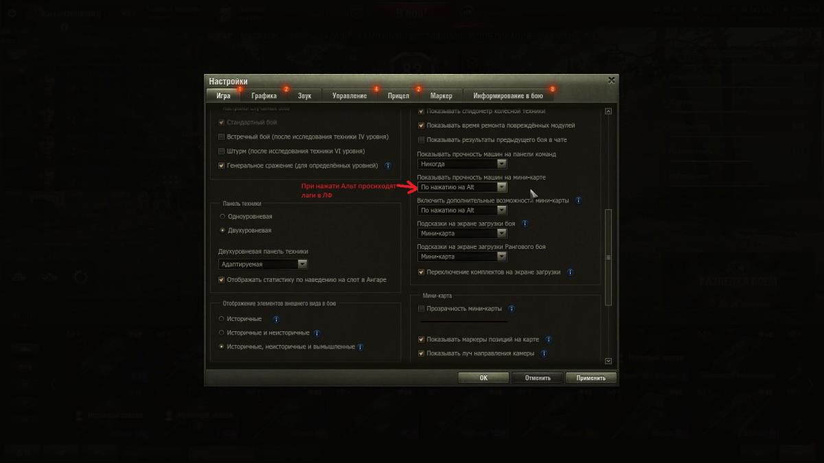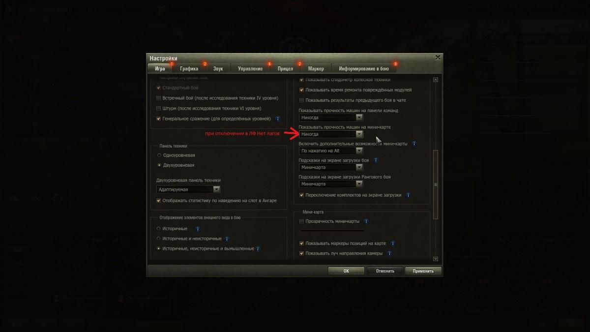 Не знаю куда написать поэтому пишу сюда. У меня возникли проблемы с ЛФ, а именно фризы и лаги. Обращение в ЦПП не принесло никакого решения проблемы. В прошлом году на ЛФ у меня был слабее комп и все работало стабильно на данный момент у меня стоит более мощный комп и сама игра предлагает мне поставить ультра настройки(скрин прилагаю), но в ЛФ в этом году было очень много лагов и фризов. Сегодня я вспомнил, что было введено за последний год и решил по очередно выключать функции на вкладке игра. Мной был обнаружена проблема, которая вызывает данные лаги в ЛФ. Это подсвечивание прочности союзников и противников на мини карте. При отключении данной функции лаги на ЛФ свелись к минимуму. Ниже я привожу скриншоты какую именно функцию мини карты я отключил. Может кому-то это поможет. Обращаюсь к модератору с просьбой укажите где-то данное решение или закрепите данную тему.