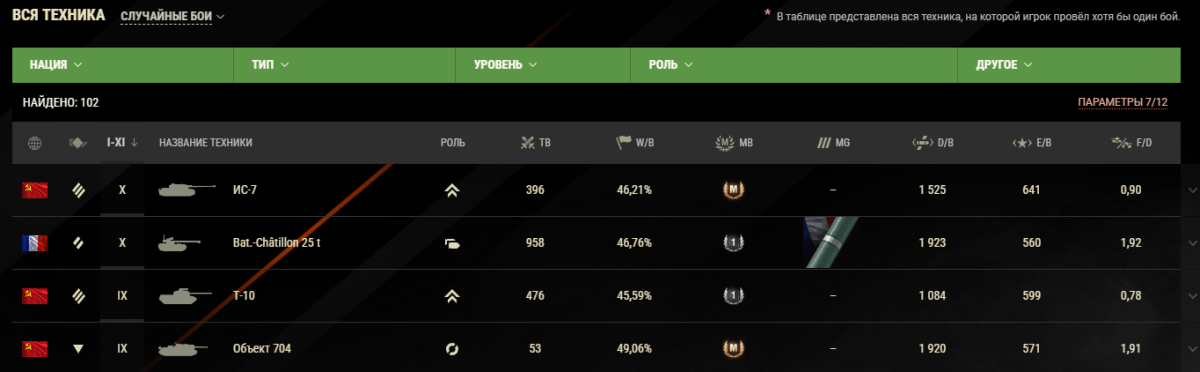 Вот эта статистика .Тут и техника , и общие количества боев . https://forum-mt-prod.lesta.ru/monthly_12_2024/post-253324-0-51492000-1733822039_thumb.png https://forum-mt-prod.lesta.ru/monthly_12_2024/post-253324-0-36215100-1733822031_thumb.png