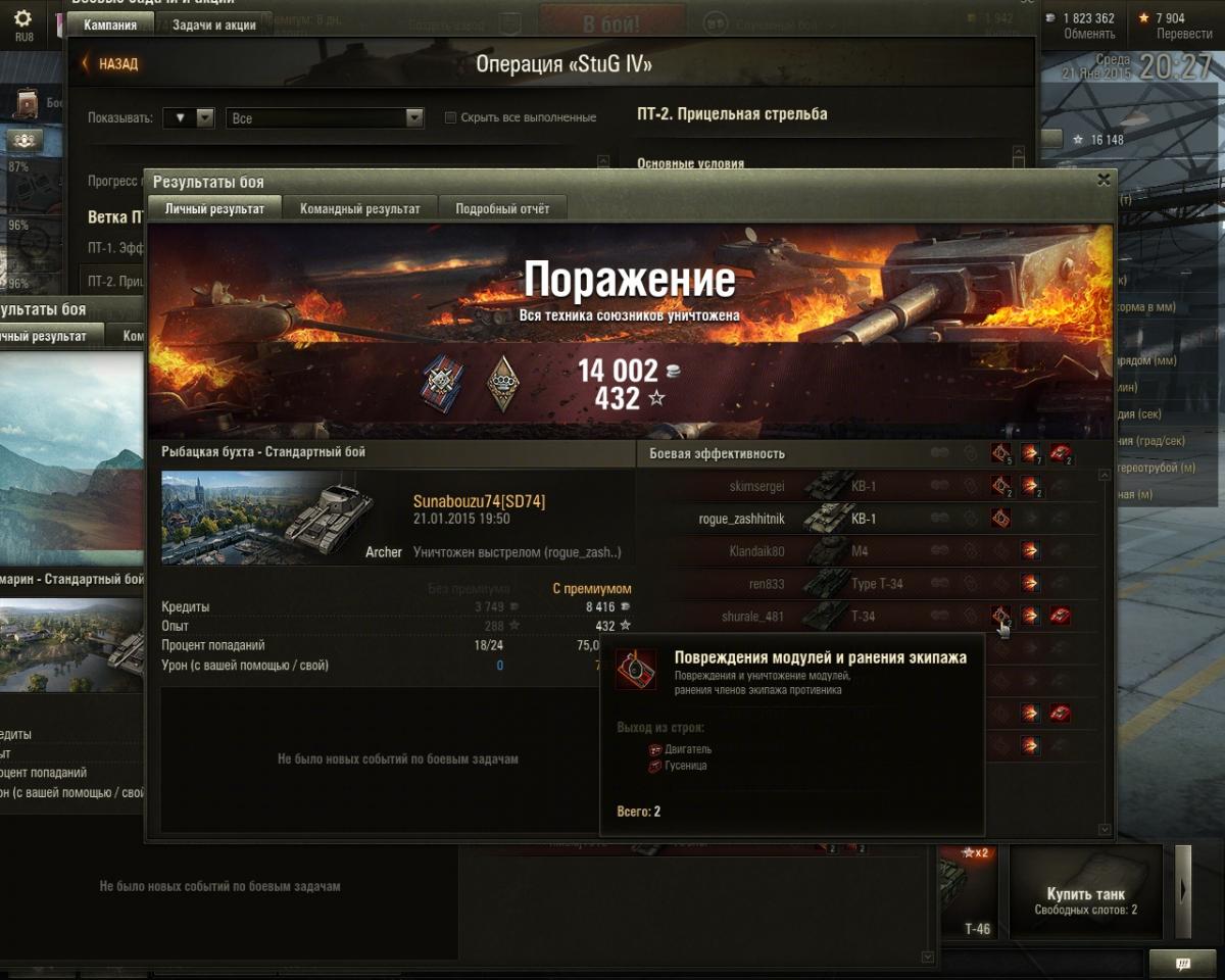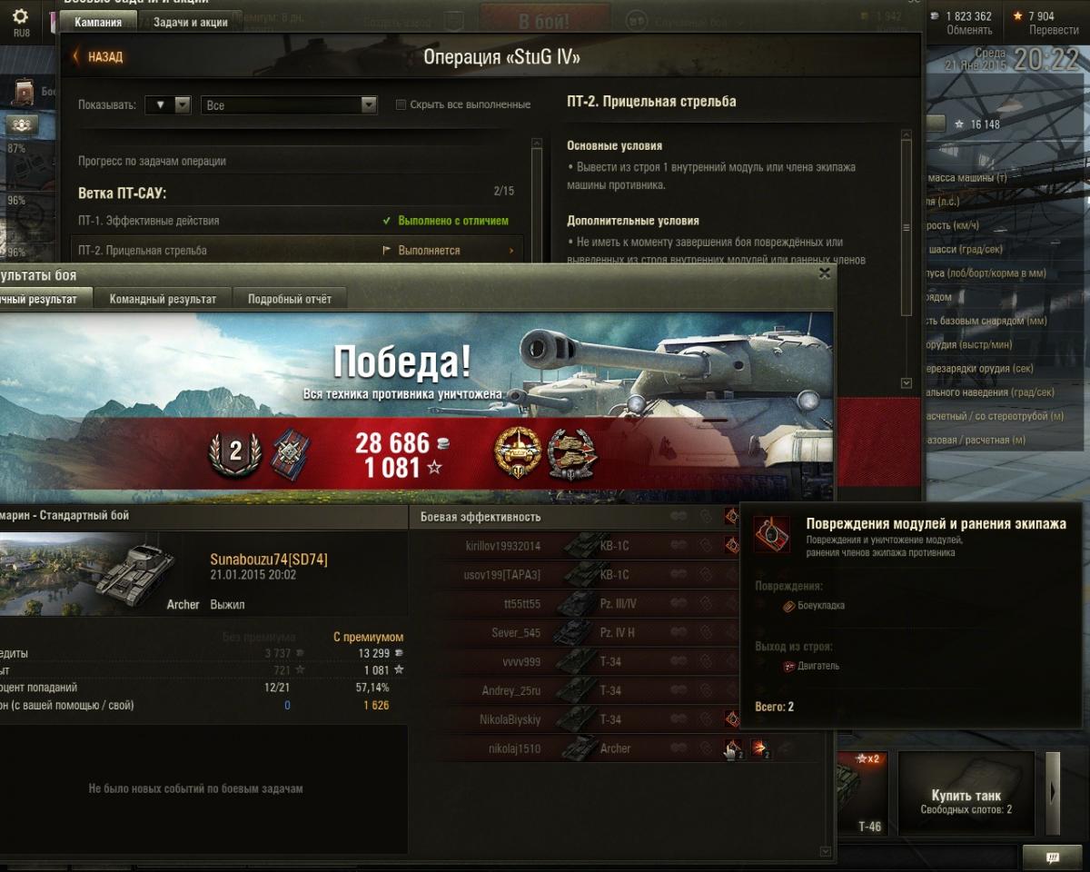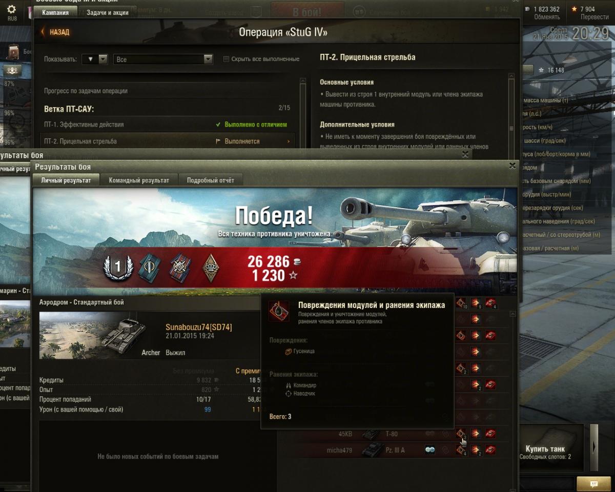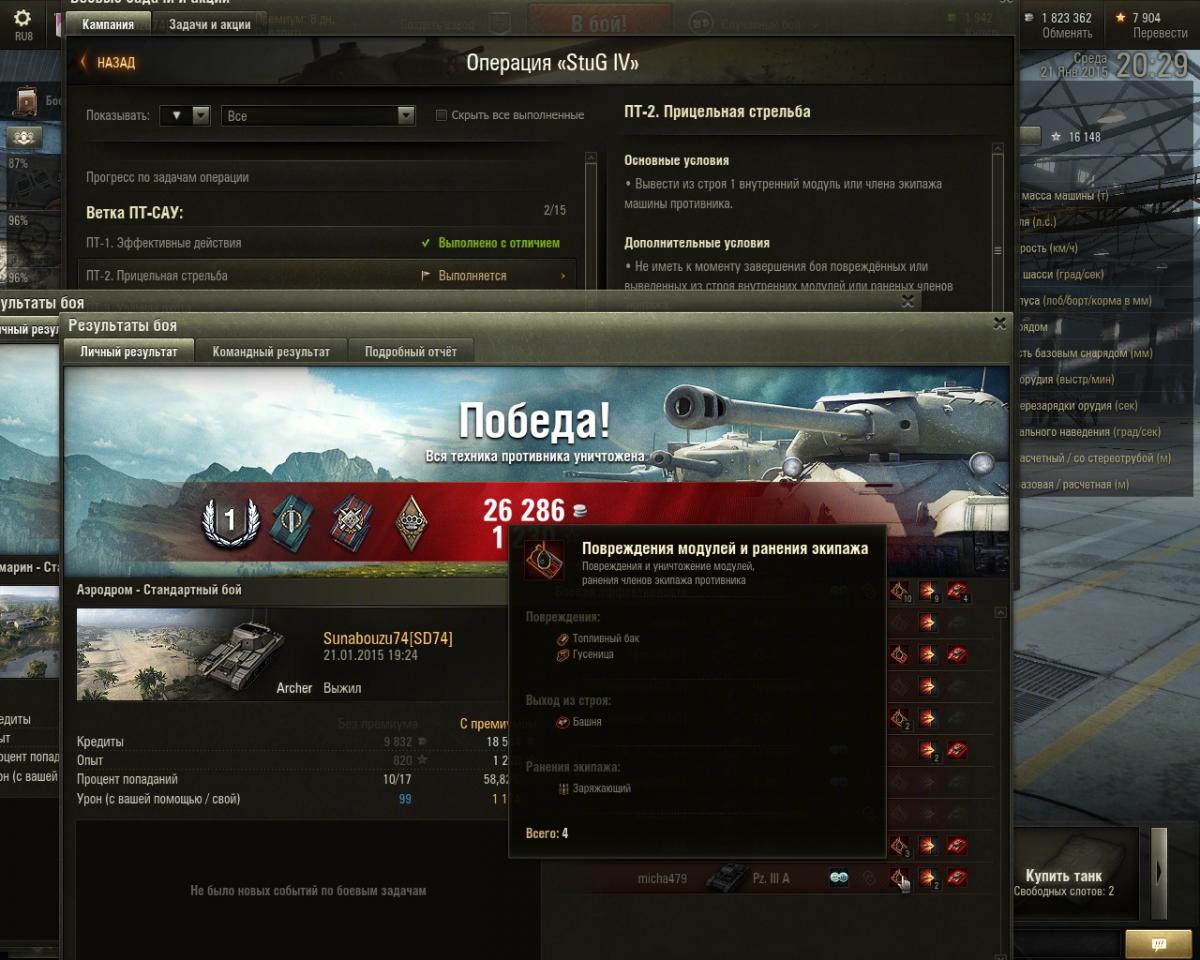 Задача дословно: "Нанести к моменту завершения боя не менее 1000 урона и не иметь при этом поврежденных внутренних модулей или раненных членов экипажа" Уже неоднократно условия выполнены досконально, а воз и ныне там... Стоит уточнить, что задача активна, проверяется перед каждым боем и не единожды перезапускалась. Пару реплеев приложу, остальные на данный момент искать влом. http://wotreplays.ru/site/4463762 http://wotreplays.ru/site/4463740#el_-halluf-sunabouzu74-kv-4 http://wotreplays.ru/site/4463737#monastyr-sunabouzu74-kv-4