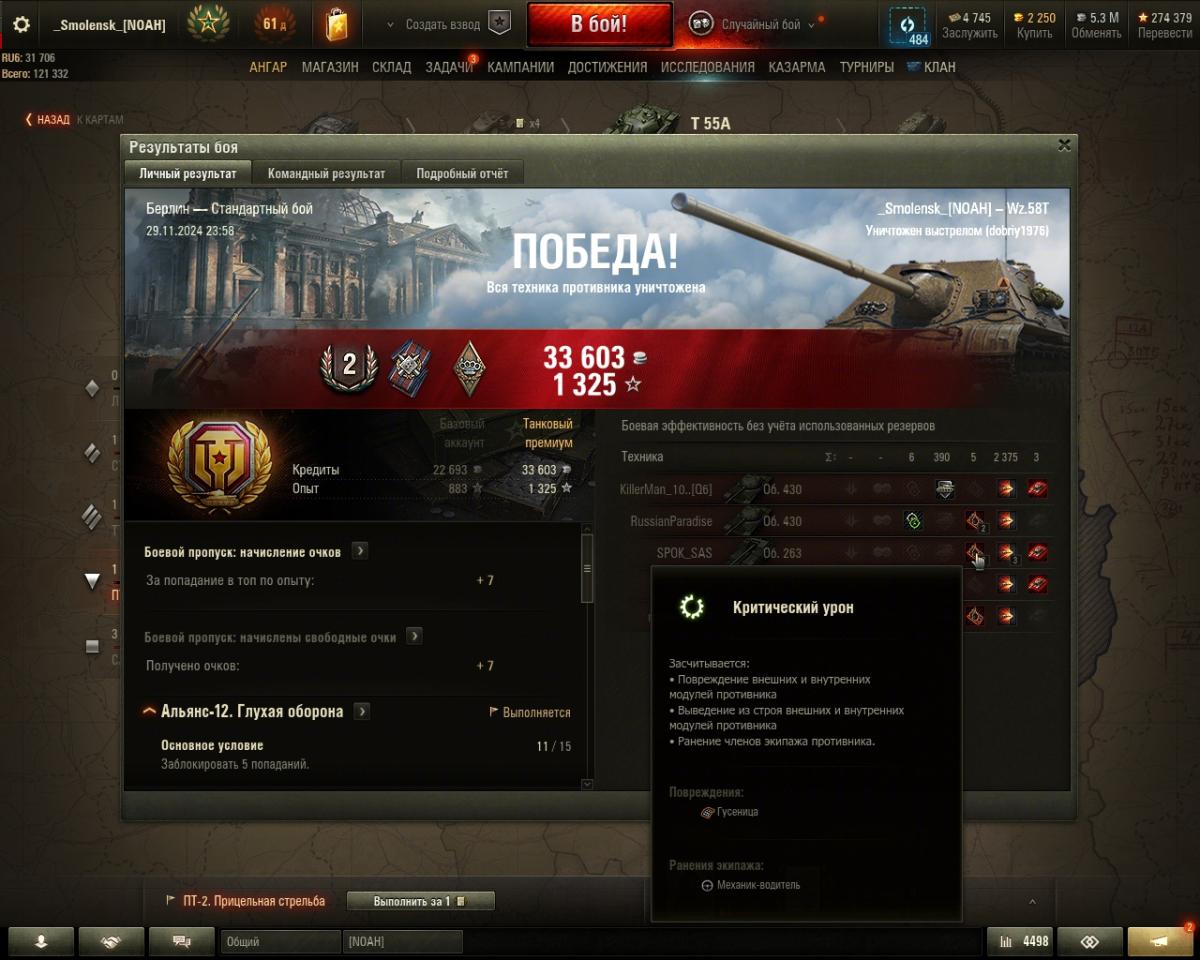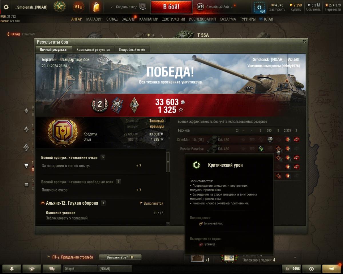 Доброй ночи! Прошу помощи с незасчитанным ЛБЗ на ПТ-САУ Т-55 А. 2 тысячи урона настрелял, криты внутренних модулей есть ( если я правильно понимаю, топливный бак и боеукладка-это они+ крит механика-водителя). Основное условие не выполнено... Что я не так понимаю в условии ЛБЗ? https://forum-mt-prod.lesta.ru/monthly_11_2024/post-254362448-0-53867400-1732915432_thumb.jpghttps://forum-mt-prod.lesta.ru/monthly_11_2024/post-254362448-0-74239600-1732915447_thumb.jpghttps://forum-mt-prod.lesta.ru/monthly_11_2024/post-254362448-0-67914600-1732915464_thumb.jpghttps://forum-mt-prod.lesta.ru/monthly_11_2024/post-254362448-0-65074200-1732915480_thumb.jpg