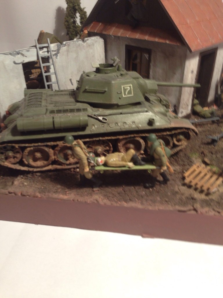 Благодарю. В планах поменять танк, точнее поставить такую же 34ку, только полностью затонированную, даже может быть с рабочей ходовой, чтобы танк сочетался с диорамой, а этого ветерана отправить на пенсию. Насчет блеска металла немного не понял, имеете ввиду, что это не слишком реалистично, стоит подтонировать и залачить матовым? Стоячий танк давно хотел исправить, путём замены на подбитый, с открытым люком мехвода, из которого вытаскивают его самого. Сюжет заключается в том, что советские войска отобрали позицию у противника и защищают её, это показывается немецким орудием, оставшимся около дома. Еще раз благодарю, очень интересно читать критикую людей, особенно моделистов.