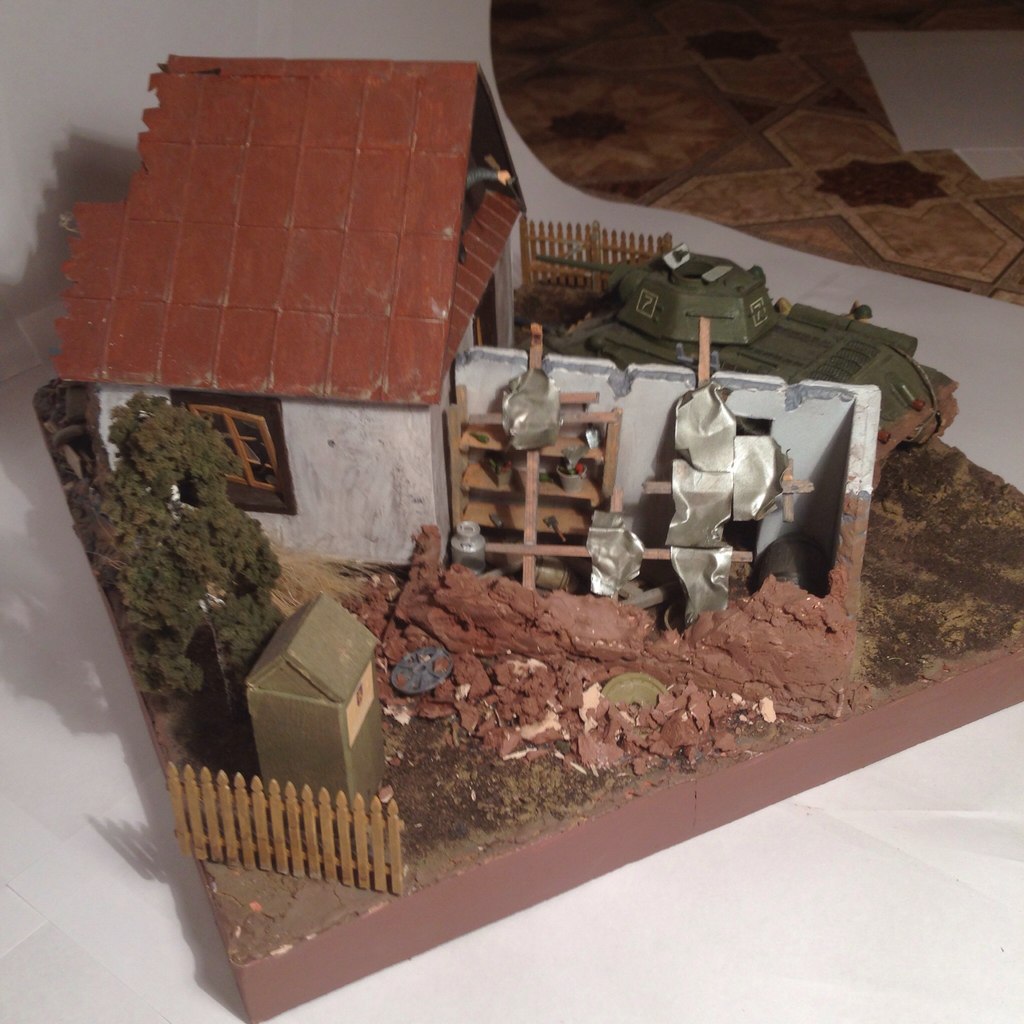 Решил выложить свою первую, и не очень удачную диораму. Танк, которой установлен на ней, был собран намного раньше самой диорамы, так сказать ветеран. Его сборка не на высоте, но другой танк поставить не смог, не вписываются они в данную диораму. Тонировки/смывки/модуляции/сколов/подтёков на нём нету, ибо не люблю делать это на советских танках. Диорама собиралась относительно долго, около 10 месяцев, но качество говорит об обратном). Гусеницы наборные, трос самодельный, фара травлёная. Не обращайте внимание на грязь на траках, это была пробная попытка,и она ужасна:) Уже давно загрязняю траки совершенно другой технологией, которая выглядит отлично, в следующий раз выложу новые модели. Шифер/развалины/стеллажи/окна/распорки на крыше/обломки внутри дома/почва/кирпичи/сено/печка - всё самопальное. Если кому интересно, какие наборы использовались, отвечу.