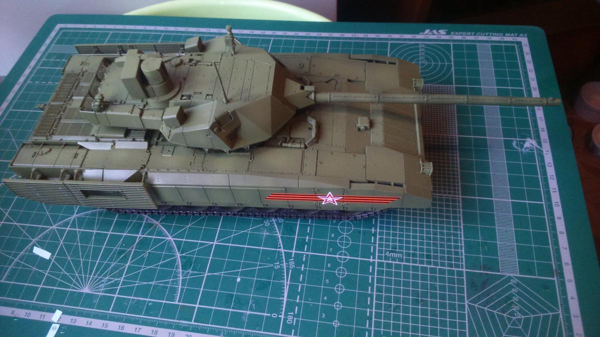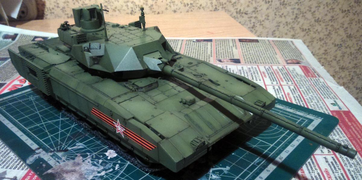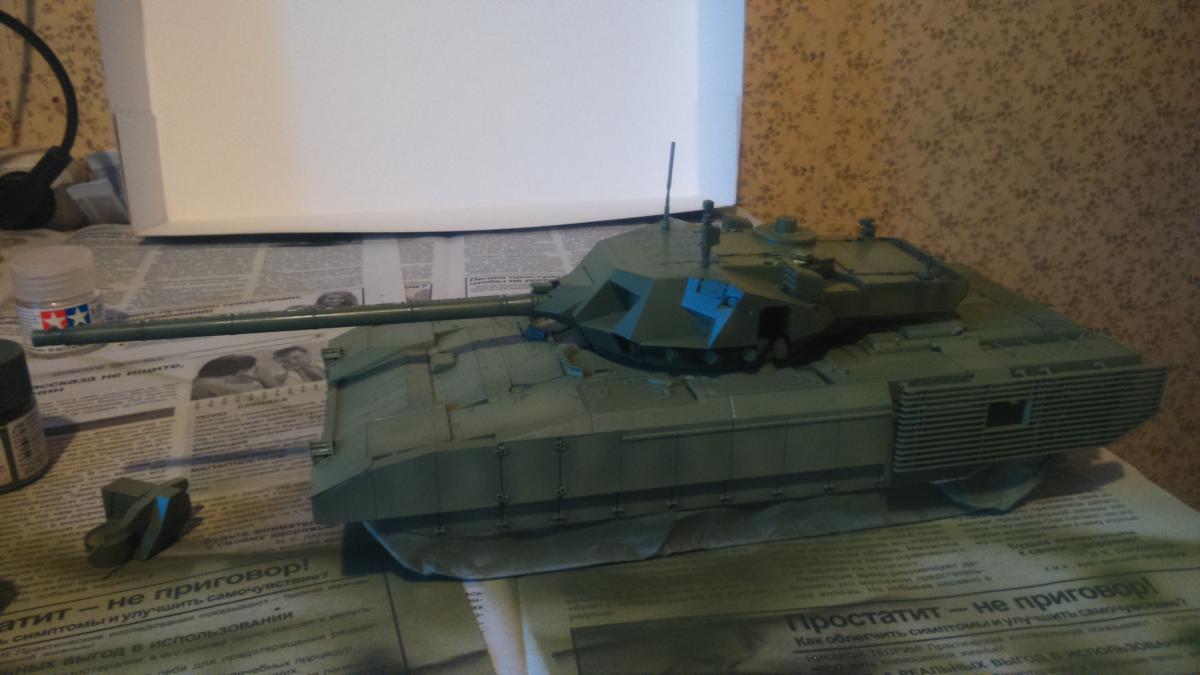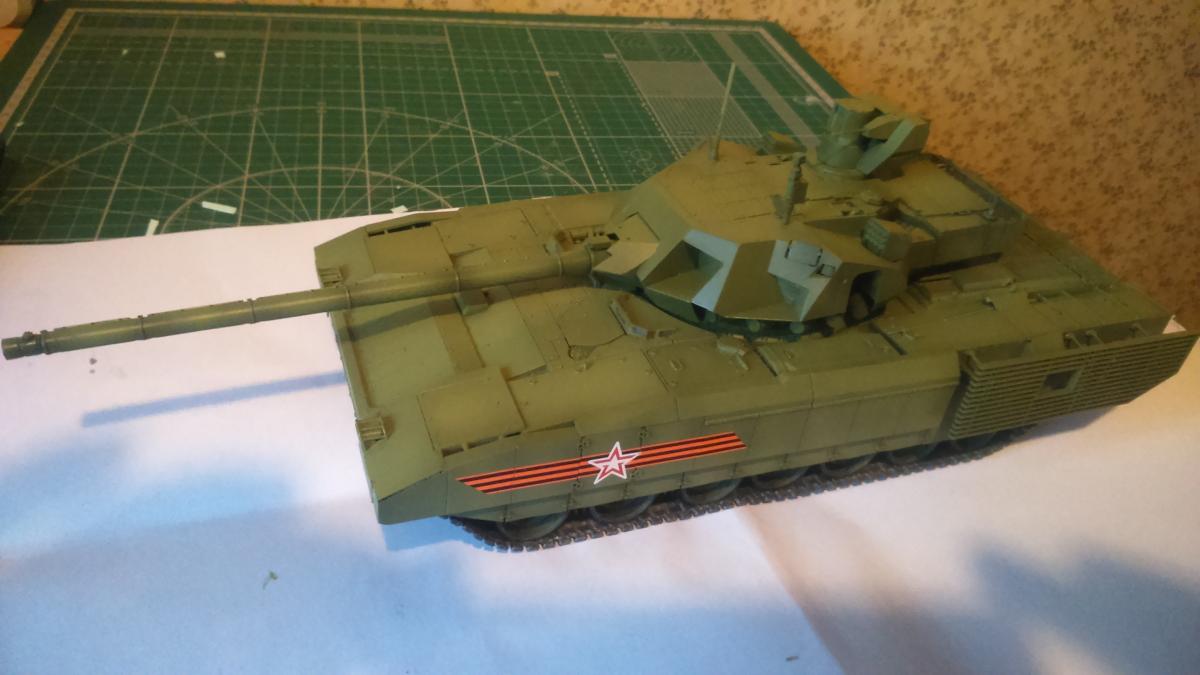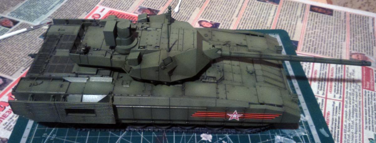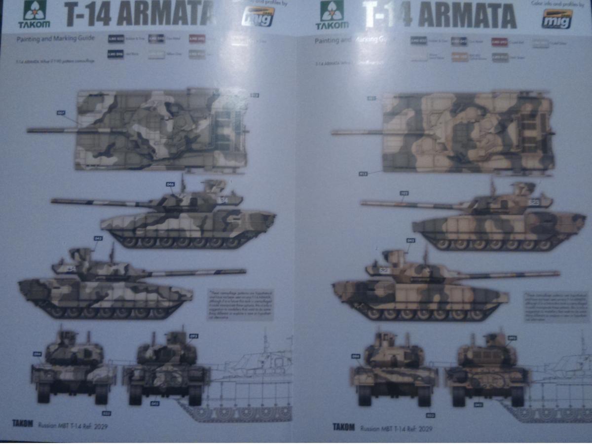 По поводу окраса, - ТАКОМ предлагает для окраски несколько вариантов: http://cdn-frm-eu.wargaming.net/wot/ru/uploads/monthly_02_2016/post-257634-0-73846800-1454765425_thumb.jpg http://cdn-frm-eu.wargaming.net/wot/ru/uploads/monthly_02_2016/post-257634-0-03180600-1454765450_thumb.jpg соответственно с парада Победы и три варианта камуфляжа. По моему ЛИЧНОМУ мнению красить во что-то кроме парадного варианта смысла нет, объяснюсь: тот вариант, что был на красной площади, по некоторым данным, не окончательный. В машинах которые серийно пойдут в армию будут изменения, сильней всего они затронут башню, соответственно как танк Т-14 будет выглядеть окончательно сегодня можно только догадываться. Те же яйца с камуфляжем, каким он будет, - знают только в ГШ МО, да и то скорее всего смутно. По итогу, собирается модель Т-14 с парада 9 мая на Красной площади.