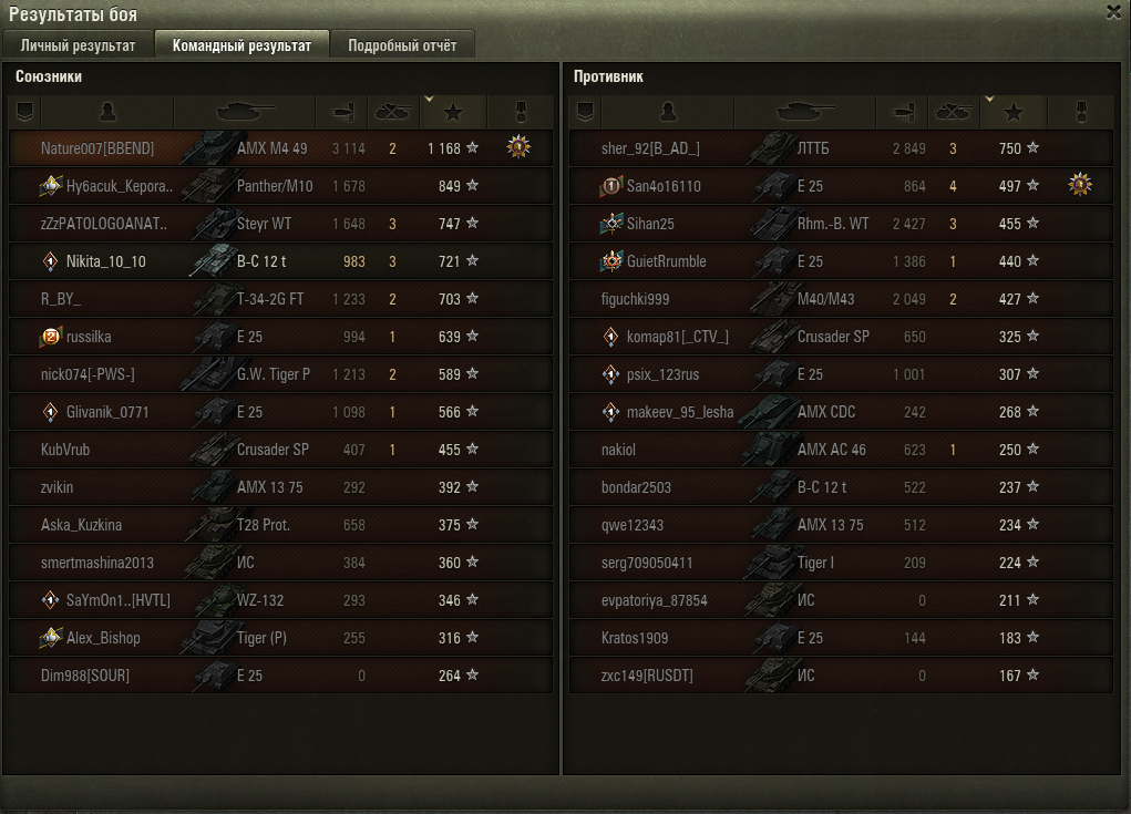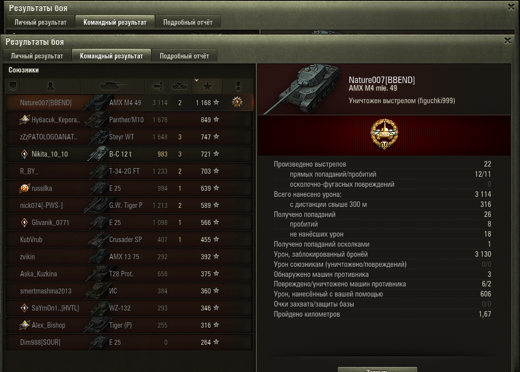 http://cdn-frm-eu.wargaming.net/4.5/style_images/wg/snapback.pngFrai14 (16 Сен 2018 - 16:20) писал: на том где получается играть лучше всего. у меня прокнуло на баджере и фв201(А45) http://wotreplays.ru/site/11537034#rudniki-frai14-fv201_a45 Ну знаешь, вроде много где есть мастера...но вот специально их зарабатывать на чем либо...эта та еще наркомания. Слишком большое влияние оказывает игра союзников и сетапы команд. Во многих катках просто не хватит урона по вражеской команде из-за легких сетапов, много лт и пт...набить в таких раундах мастера просто не возможно. И я не знаю почему, но до 7лвл мне очень часто попадаются легкие сетапы команд, 8ки практически не вижу чтоб на них урон заработать. Но стоит взять 8ку и все кардинально меняется, попадаю часто в середину или низ списка...но вот не задача на том чем я играю довольно хорошо(лт), никак не получается взять Мастера на амерекоских ЛТ. Хотя за союз и францию я вообще без каких либо проблем выполнил 15е задачи. И мне просто ооочень нужно было сделать доп условие...т.к. не делал ветку с немцами...думал время много и делал с отличием СССР и Францию. А тут то и время кончилось можно сказать Посмотрел задачи на Химеру 15ые, так там вообще сейчас ад и содомия написана в доп условиях: Цитата Дополнительные условия:В 3 боях из 15 получить знак классности «Мастер». Это просто сверх идиотизма, ничуть не лучше чем поджечь два раза за бой. А еще когда только тебя арты и фокусят, это вообще весело - вот последний мастер на доп условие к примеру - http://wotreplays.ru/site/11544333 http://cdn-frm-eu.wargaming.net/4.5/style_images/wg/snapback.pnglistLogic (16 сен 2018 - 16:44) писал: делал на хелкете с отличием не вышло, только 1 мастер хелкет уже не тот и мета ваще не птшная за 3 дня охоты набил 127к чистого опыта... Да я вот тоже на хелкете делал, вполне не плохо но надо со 105 акантовым бензом играть. http://wotreplays.ru/site/11544285#-nature007-m18_hellcat http://wotreplays.ru/site/11544322 http://cdn-frm-eu.wargaming.net/4.5/style_images/wg/snapback.pngfil0808 (17 Сен 2018 - 22:56) писал: Уникальнaя эмблемa за Операцию «Excalibur». Танк получил а эмблему нет. Я что ни так понял?И хде моя эмблема? ) А)? И да WG, почему мне предложили продолжить ЛБЗ на Химеру я согласился...но задания так и не доступны на химеру!! Ох уж любители багов! )