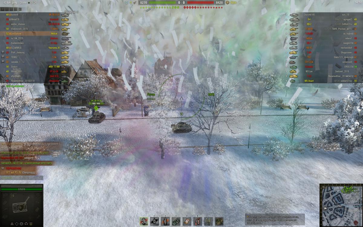 В 9.12 никаких проблем не возникало. После установки 9.13 практически сразу начались глюки - Салюты на игровых картах, а не только в ангаре - Дым из выхлопной трубы отчетливо виден как полупрозрачный квадратный "спрайт" отлетающий из трубы и постепенно пропадающий - Странное "подергивание" танков во время движения при прорисовке камуфляжа на них и надписей Окончательно добили вертикальные огромные спрайты внутри которых падают нарезанные ленточки бумаги (я так понимаю это видимо снег идет) на снежных картах (см. скриншоты). Удаление модов ситуацию не улучшило. Все эти "спецэффекты" проявляются переодически. Общаясь с игроками выяснил, что примерно такая же ситуация у всех. Не зависимо от видеокарты, ОС и тп и тд. Хотелось бы услышать от господ разработчиков когда выйдет патч устраняющий данные неприятные эффекты. ОС: Win7 x64, 8 Gb ОЗУ Видео: Nvidia GeForce GTX 660 (драйвер: 361.43-desktop-win8-win7-winvista-64bit-international-whql)