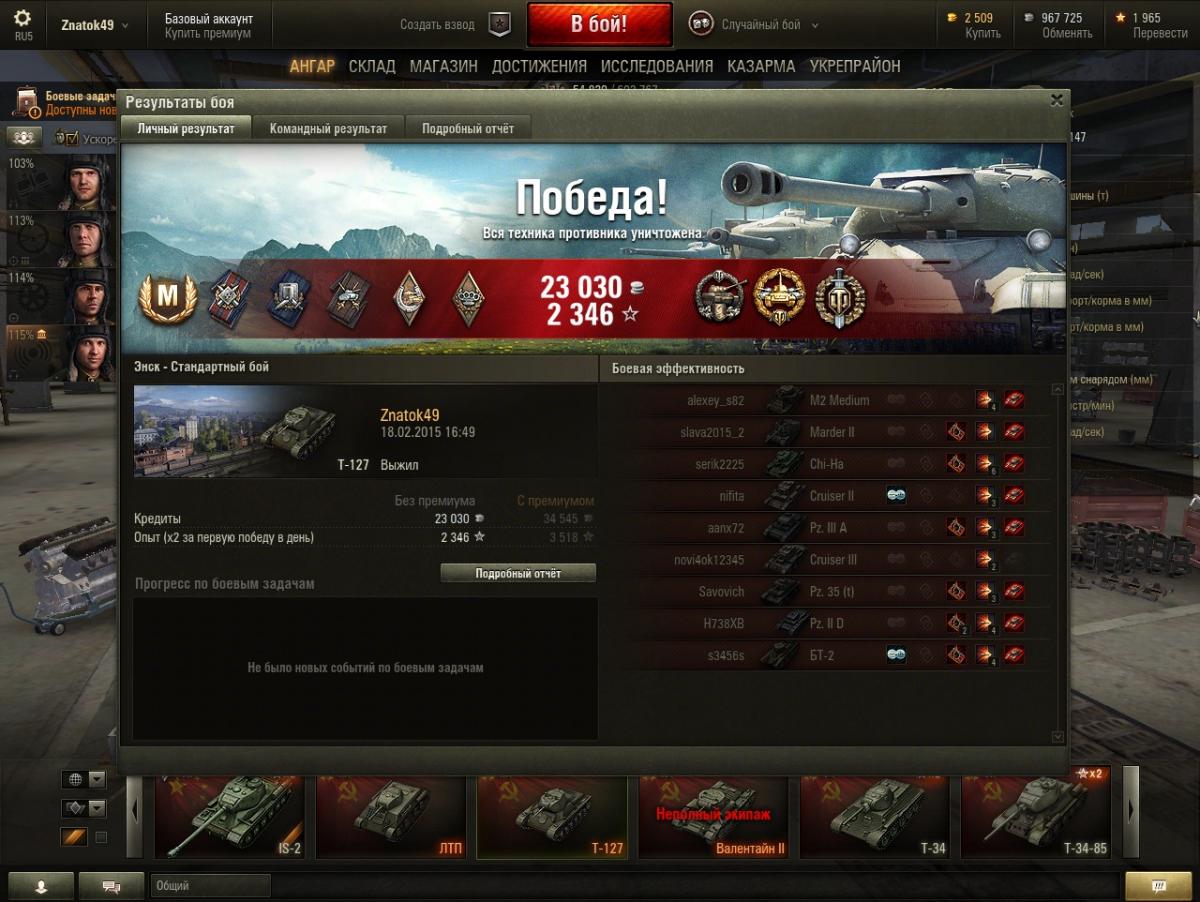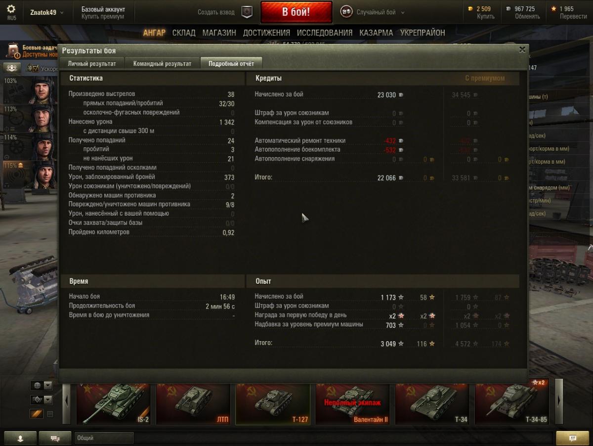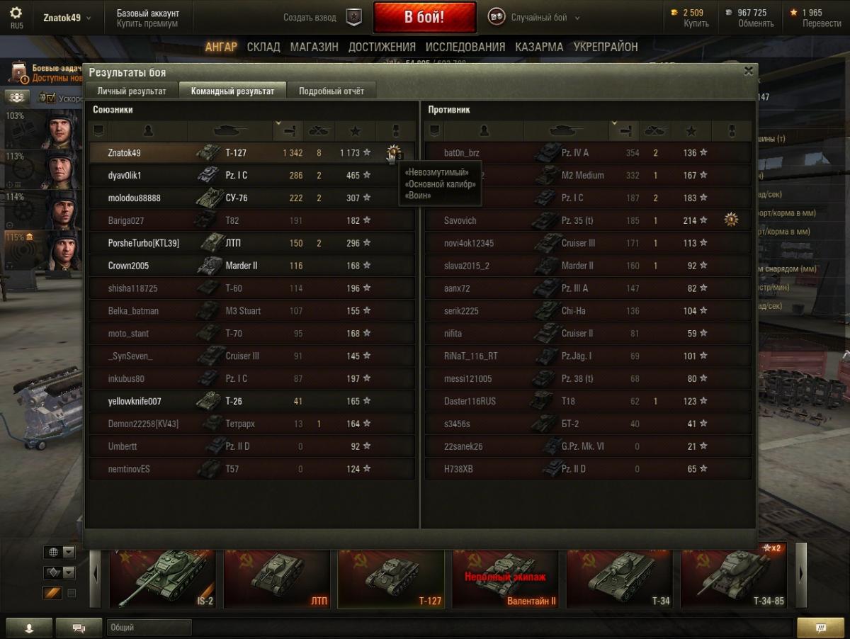 Ну да, на тесте чаще кидает к 7 уровням + засилье коричневых. Но я катал с бб и голду практически не использовал. Как танк прощает ошибки ? Ну после встречи с ИСом мы можем выжить, что на остальных ст 5 уровня невозможно, приличная скорость, хорошее, хотя и косое орудие и + танк редко горит. К тому же я сейчас ему собираю женский экипаж, а с двумя перками танк теряет большинство своих недостатков Касательно раков в топе...Вспомнил как на кв попал к 4 уровням...От переизбытка счастья слился как баранhttp://cdn-frm-eu.wargaming.net/4.3/style_emoticons/wot/Smile_sad.gif P.S. Неделю назад был аналогичный бой на Т-34, 1700 урона, слив...