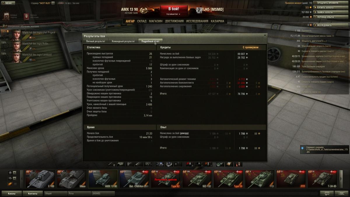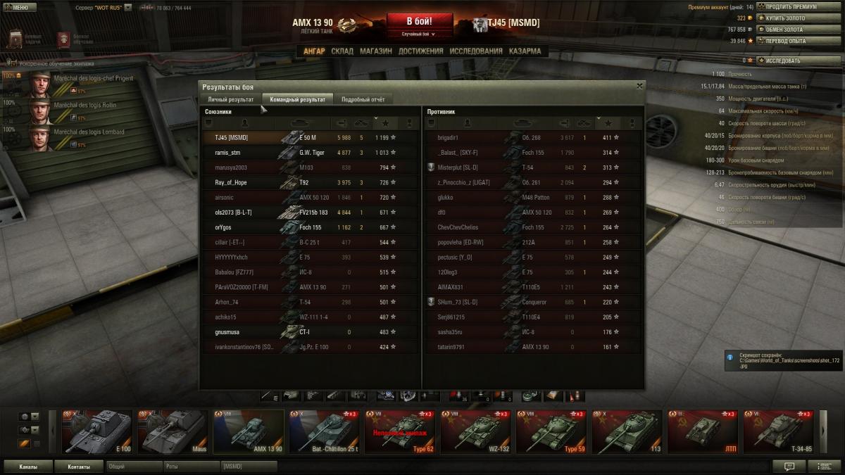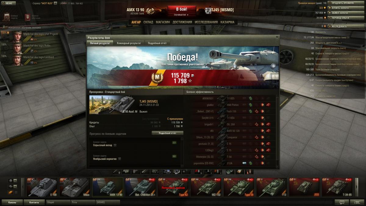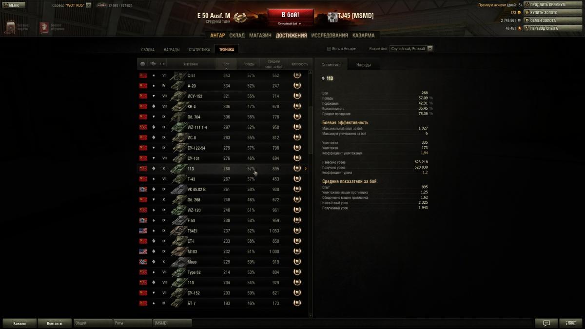 Во время марафона откатал 200+ боев на 113. До этого не выкатывал после нерфа пробития. Играл почти без голды. Нафармил на 1.5 десятки, купил е50м и нафармил еще 3кк (с премом). Единственое что припекало - это криты бк от всякой мелочи, причем по 2 выстрела подряд. Однажды даже взял невозмутимого танкуя против 9-10 танков. Ну и общая соло-рандомная стата вышла такая: http://cdn-frm-eu.wargaming.net/wot/ru/uploads/monthly_11_2013/post-2539089-0-16535800-1385824211_thumb.jpg Вобщем танчик ни лучше ни хуже других 10 лвл, конечно не т57 или фоч, но с прочими вполне на уровне, с вертушки раздает, снаряды отбивает, главное беречь нижний лист, борта, и ерзать - чтоб в лоб башни не засаживали.