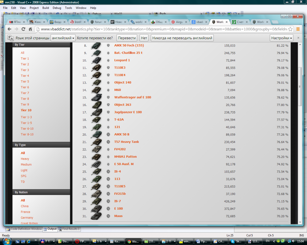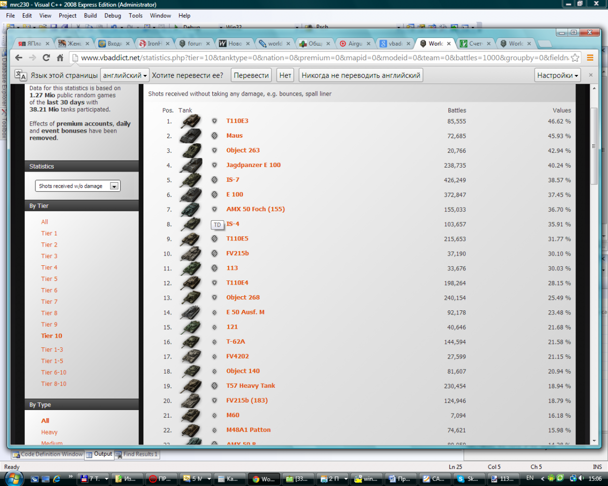 Еще немножко статистики. Для начала процент побед среди всех 10-к: http://cdn-frm-eu.wargaming.net/wot/ru/uploads/monthly_12_2013/post-2539089-0-54002300-1386760824_thumb.png Средний опыт за бой среди всех 10-к (тут все печально): http://cdn-frm-eu.wargaming.net/wot/ru/uploads/monthly_12_2013/post-2539089-0-45557700-1386761274_thumb.png Средний урон за бой среди 10-к: http://cdn-frm-eu.wargaming.net/wot/ru/uploads/monthly_12_2013/post-2539089-0-32977700-1386760870_thumb.png Средний процент попаданий с пробитием (к вопросу о занерфленом пробое): http://cdn-frm-eu.wargaming.net/wot/ru/uploads/monthly_12_2013/post-2539089-0-14091900-1386760961_thumb.png Ну и на закуску, средний процент попаданий по танку без урона (к вопросу об отсутствии брони): http://cdn-frm-eu.wargaming.net/wot/ru/uploads/monthly_12_2013/post-2539089-0-43002900-1386761095_thumb.png