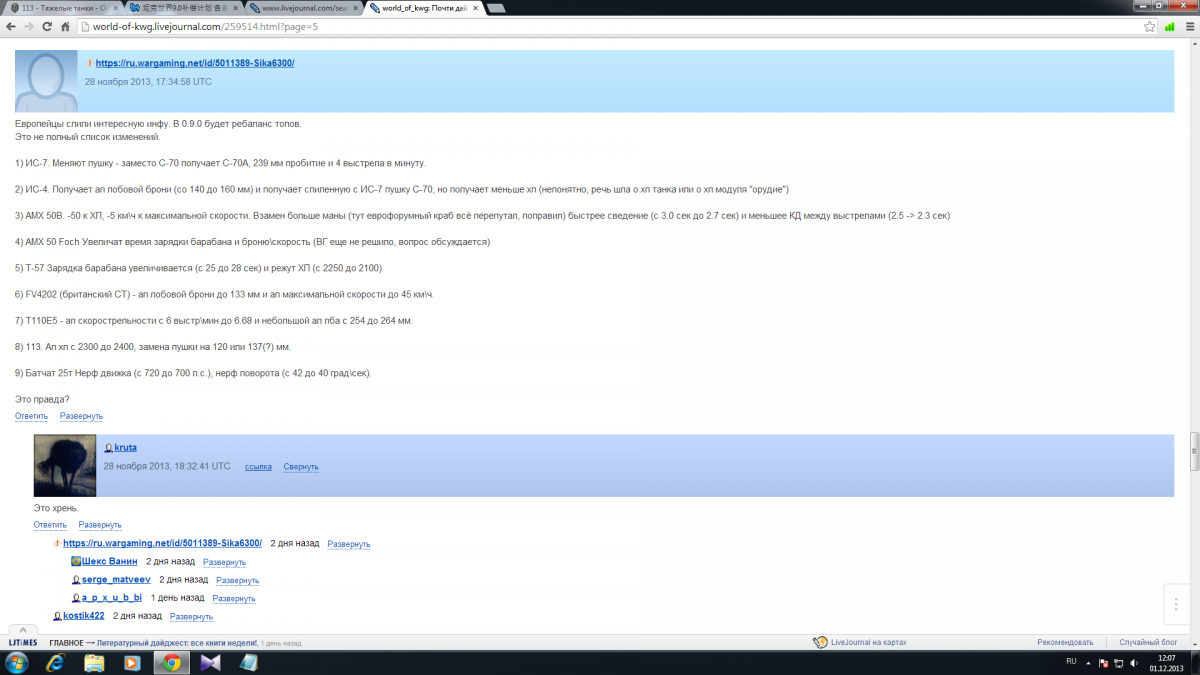 Поанализировал статистику иностранных серверов (EU, NA, SEA), там 113 в тройке уныло-непопулярных танков, на всех серверах его не качают как и ст10 брит и об. 263. По общему % побед он тоже внизу списка, как и по популярности. А вот 121 вполне себе и качают и показывают неплохие результаты. Кстати заметил на амер сервере совсем непопулярны пт, кол-во 268 и фочей чуть ли не в 10 раз меньше исов7, е100 и е5-х, а на европейском сервере 113 обгоняет по % е100 и ис4.
