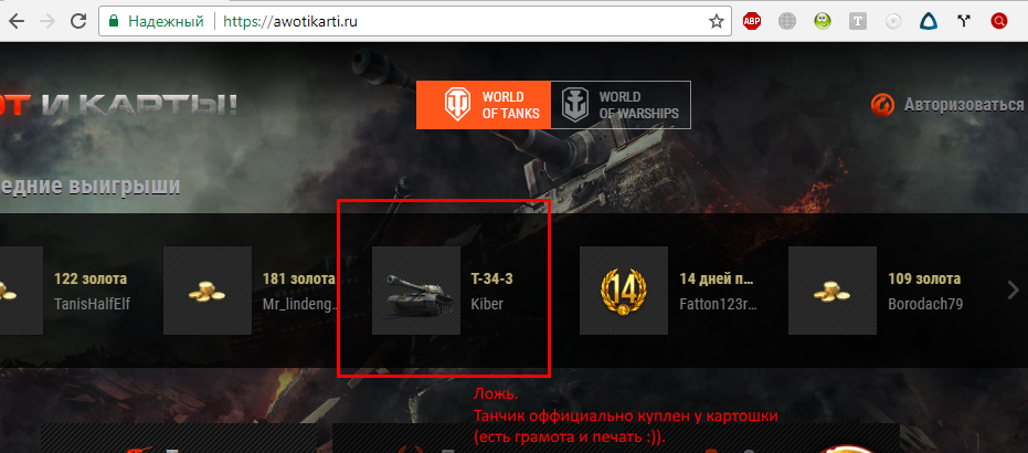 Добрый день! Недавно обнаружил что один из лохотронов (awotikarti.ru) вывесил мой ник в своем списке победителей. - см. картинку. Обнаружил случайно - пару людей спросили - а правда-ли я выиграл этот танк на этом сайте. Конечно-же это не правда, я так и сказал этим людям, предупредив что сайт мошеннический. Я предлагаю борьбу с лохотронами организовать не только внутри игры (ограждая пользователей от рекламных сообщений), но и за её пределами. Например - завести соотв. раздел форума. Или закрытую тему, пополняемую по запросу. На основе среза темы обновлять фильтры браузеров, чтобы те сами помечали их как мошеннические. P.S. Как кажется, если несчастные л*хи не будут продал**вать последние копейки в лохотронах, то ВГ от этого только выиграет.