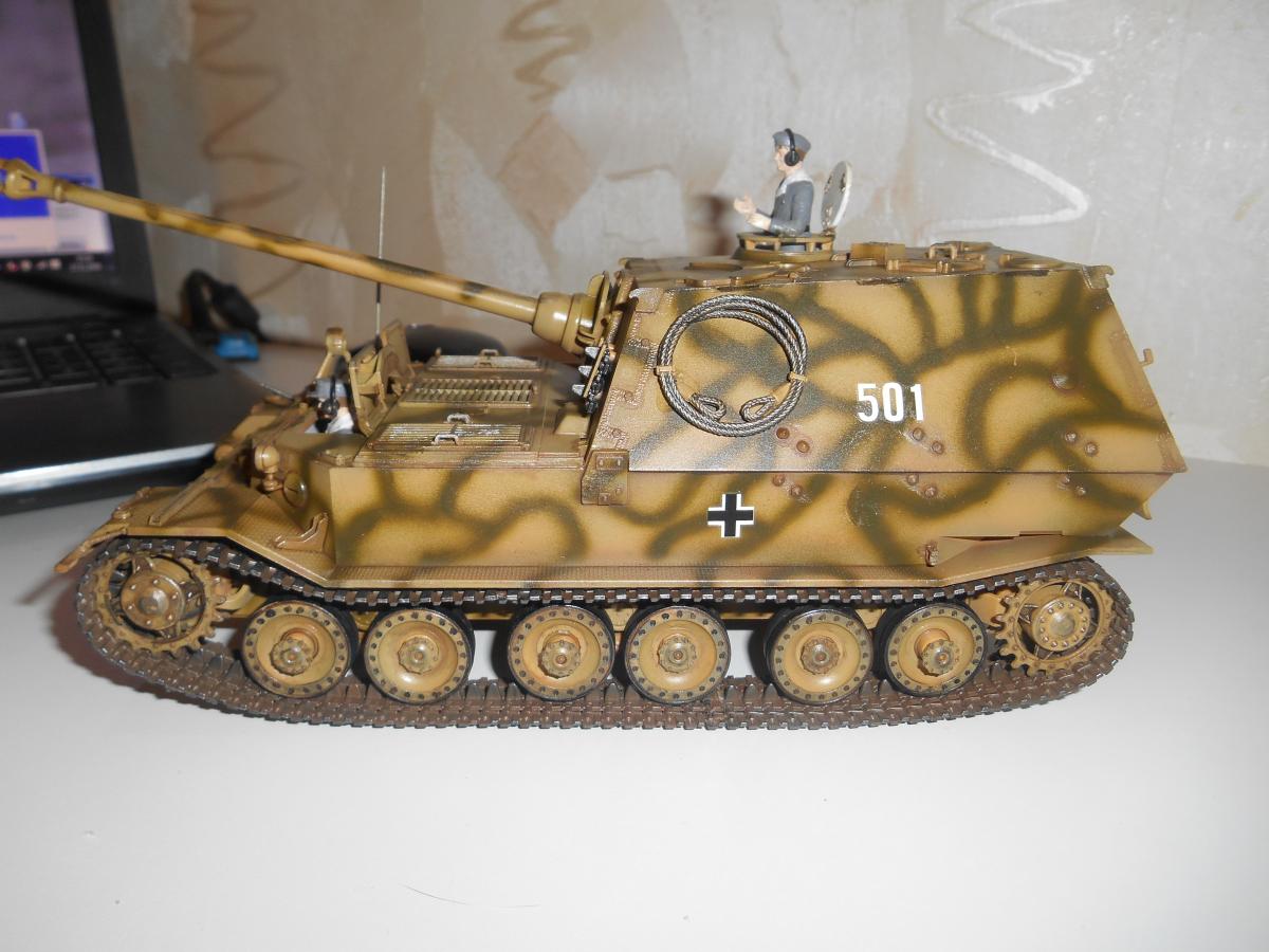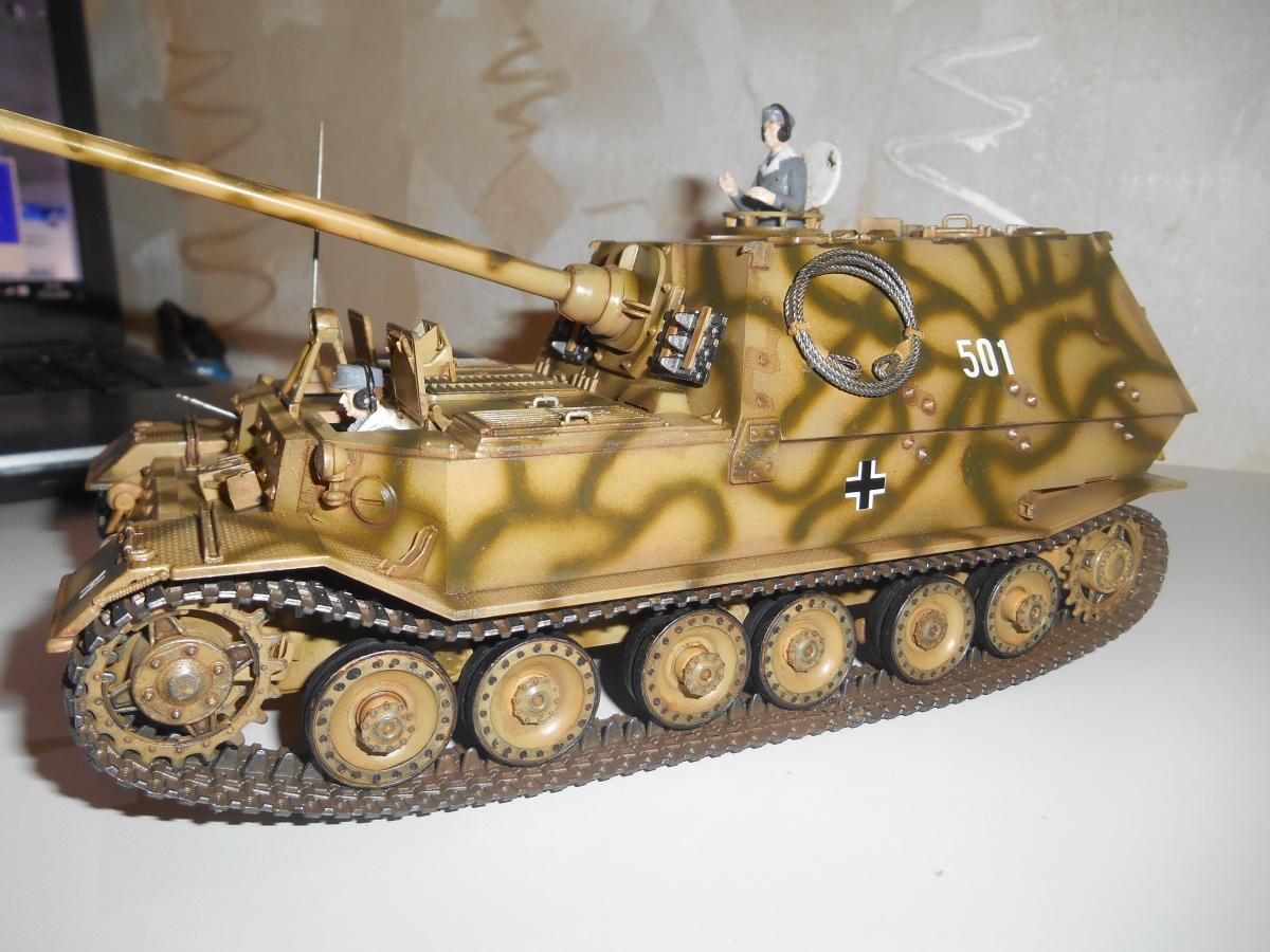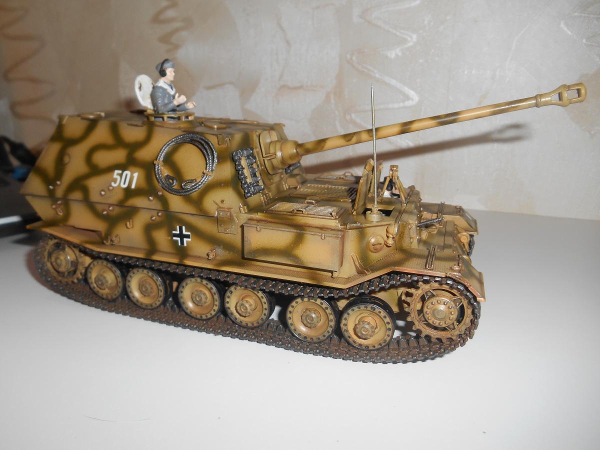 Немецкая противотанковая артиллерийская установка Фердинанд. Поступила на вооружение в 1943 году. Производитель "Звезда", масштаб 1/35. Самая мощная САУ Второй мировой войны, была вооружена 88-мм пушкой и имела толщину лобовой брони 200 мм. 6 человек экипажа управляли этой 68-ми тонной машиной. САУ принимали участие в битве на Курской дуге.