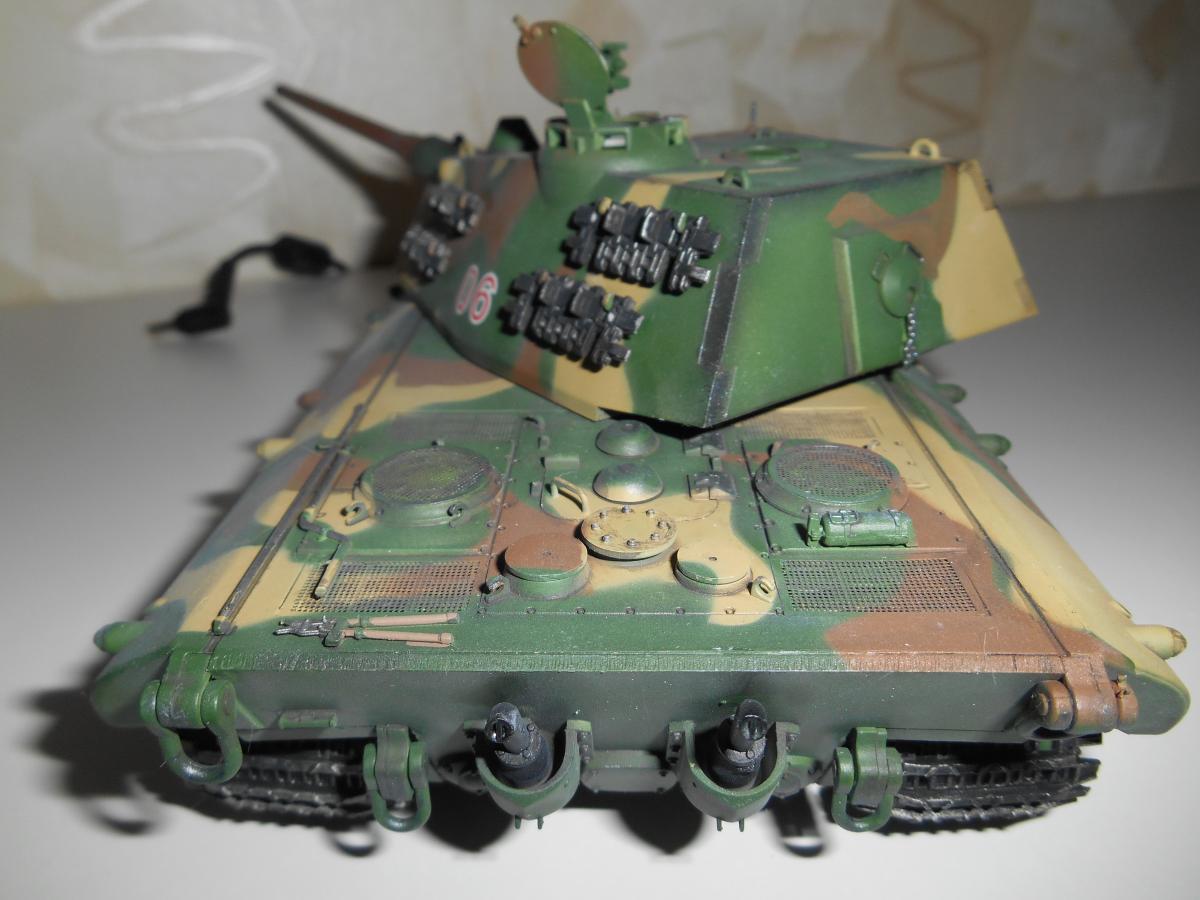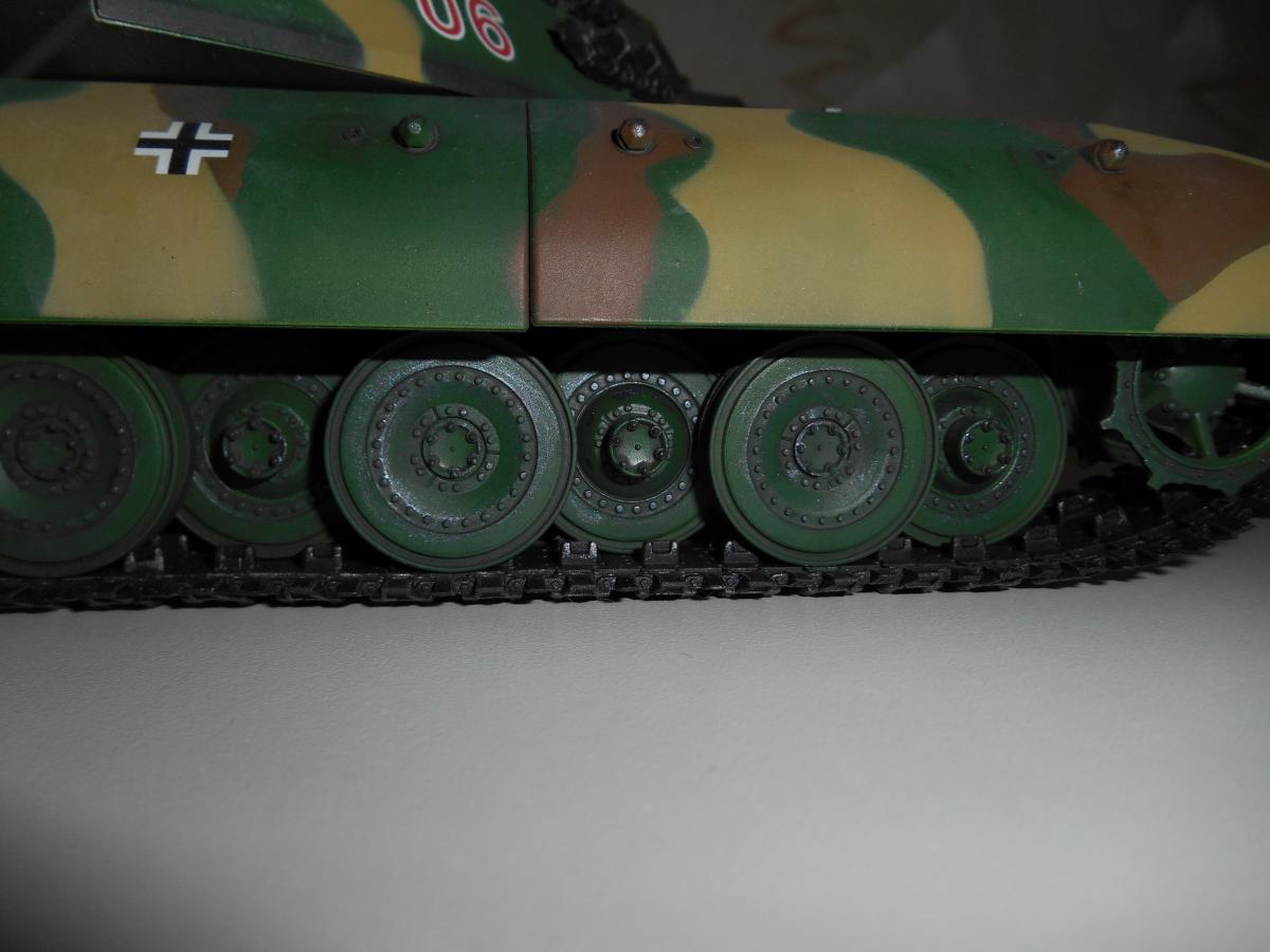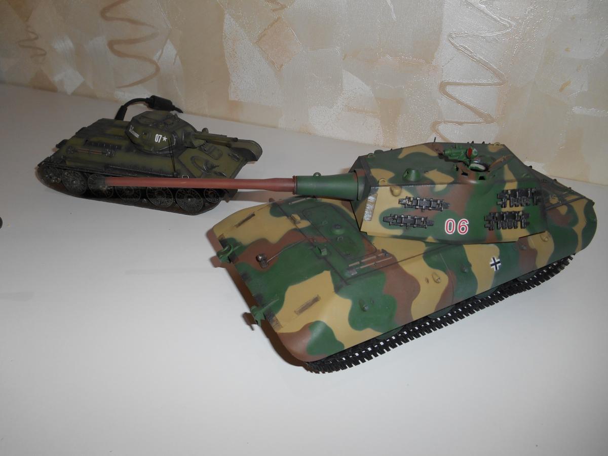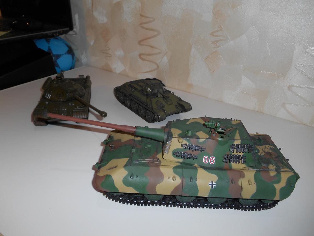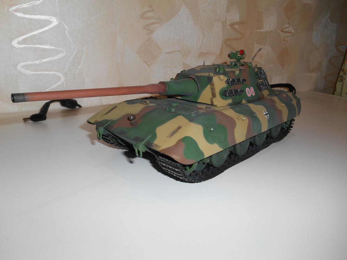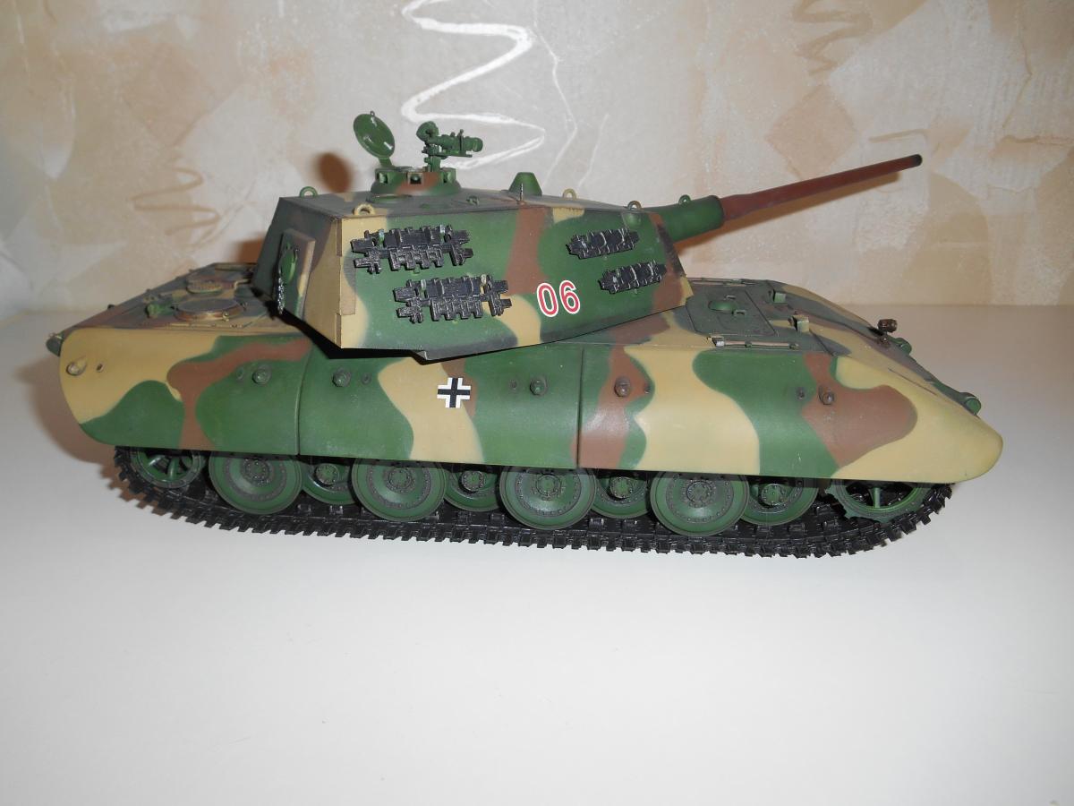 Супертяжелый немецкий танк Е-100, масштаб 1/35, модель опытного образца от Трумпетер. Разработка проекта началась 30 июня 1943 г. и не прекращалась ни на один день до самою окончания войны. Проектирование сверхтяжелого тапка стало данью увлечения фюрера гигантизмом. В конце 1944 г. *** проявил признаки здравого смысла, запретив дальнейшие работы по всем проектам тяжелых танков, но работы по Е-100, тем не менее, продолжились. Конструкторам удалось завершить большую часть проектных работ, а в Хаустенбеке под Падернборном началась сборка корпуса. Шасси и силовую установку танка подготовили к испытаниям в начале 1945 г. На танке был установлен двигатель Майбах HL-230 и трансмиссия Майбах OG-401-216В. Дифференциалы были использованы такие же. как на танке «Тигр» - Хеншель LR01. гусеницы набраны из траков фирмы Адлер, имевших в ширину 1000 мм. Толщина лобовой брони составляла 240 мм. толщина бортовой брони - 120 мм. Башню на танк установить до окончания войны не успели. На корпус в испытательных целях был установлен лишь массо-габаритный макет башни. Танк предполагалось вооружить орудием калибра 150 мм или даже 170 мм. Расчетная максимальная скорость монстра составляла 40 км/ч. Союзники много фотографировали опытный образец в Падерборне. В 1945 г. англичане перевезли корпус танка Е-100 на свой остров для исследований и испытаний. Покраска аэрографом by Lёha.