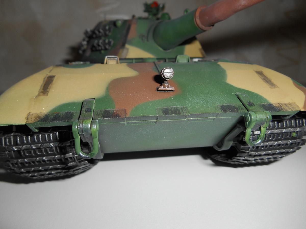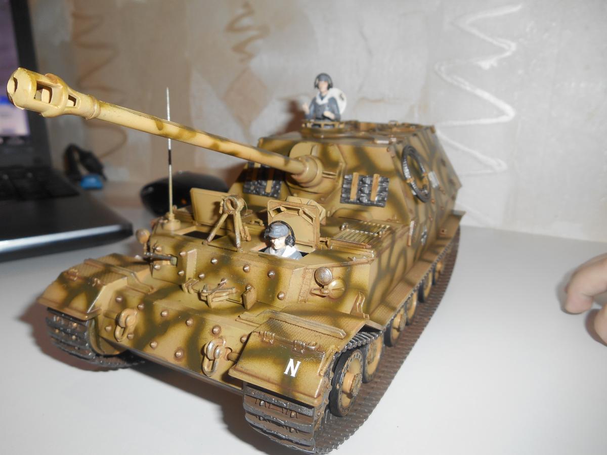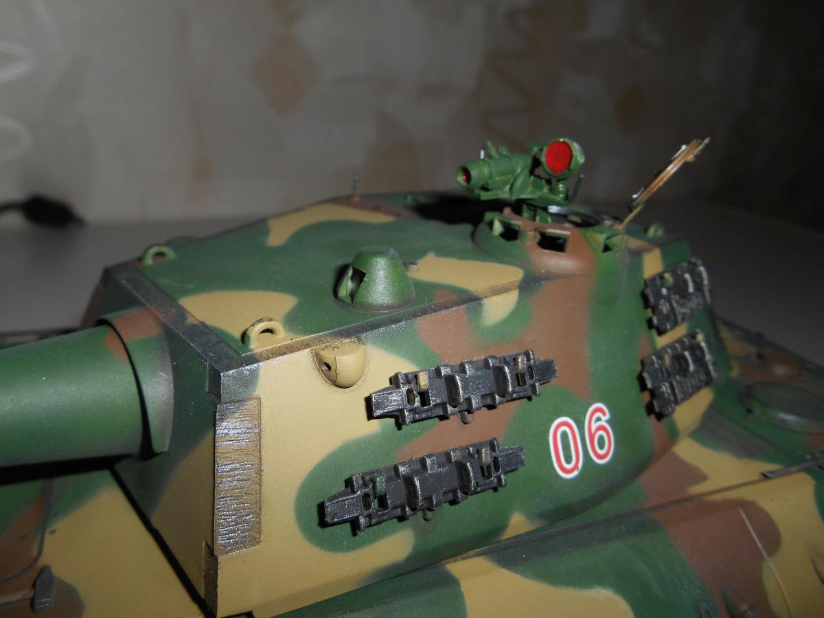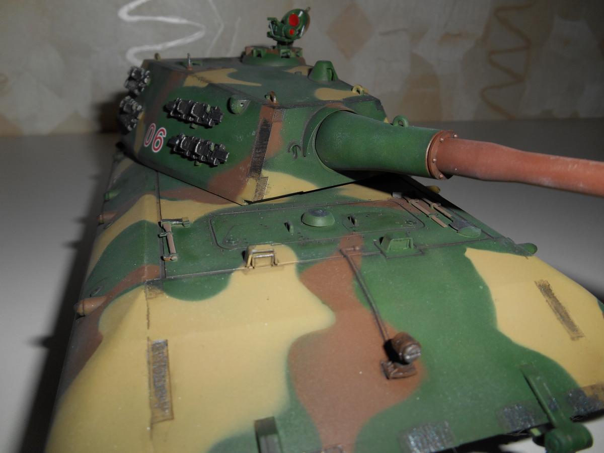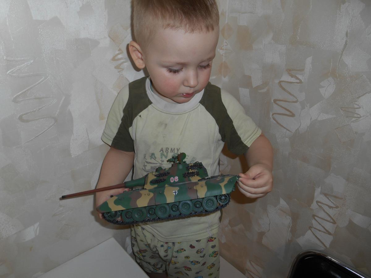 Супертяжелый немецкий танк Е-100, масштаб 1/35, модель опытного образца от Трумпетер. Разработка проекта началась 30 июня 1943 г. и не прекращалась ни на один день до самою окончания войны. Проектирование сверхтяжелого тапка стало данью увлечения фюрера гигантизмом. В конце 1944 г. *** проявил признаки здравого смысла, запретив дальнейшие работы по всем проектам тяжелых танков, но работы по Е-100, тем не менее, продолжились. Конструкторам удалось завершить большую часть проектных работ, а в Хаустенбеке под Падернборном началась сборка корпуса. Шасси и силовую установку танка подготовили к испытаниям в начале 1945 г. На танке был установлен двигатель Майбах HL-230 и трансмиссия Майбах OG-401-216В. Дифференциалы были использованы такие же. как на танке «Тигр» - Хеншель LR01. гусеницы набраны из траков фирмы Адлер, имевших в ширину 1000 мм. Толщина лобовой брони составляла 240 мм. толщина бортовой брони - 120 мм. Башню на танк установить до окончания войны не успели. На корпус в испытательных целях был установлен лишь массо-габаритный макет башни. Танк предполагалось вооружить орудием калибра 150 мм или даже 170 мм. Расчетная максимальная скорость монстра составляла 40 км/ч. Союзники много фотографировали опытный образец в Падерборне. В 1945 г. англичане перевезли корпус танка Е-100 на свой остров для исследований и испытаний. Покраска аэрографом by Lёha.