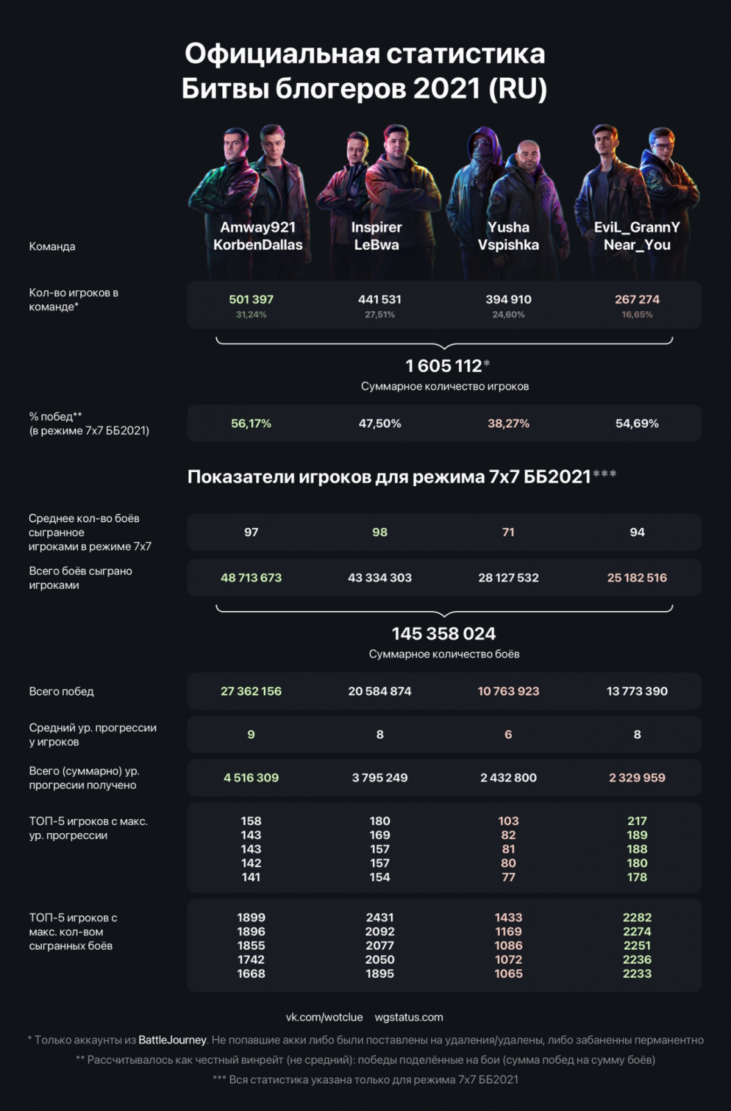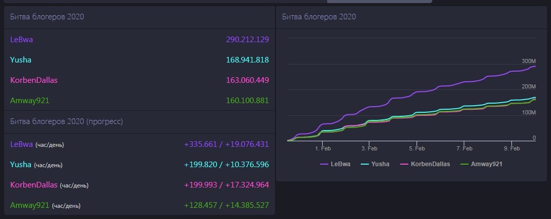 А ну-ка иди сюда (взял за шкирку и лицом в экран в упор). Смотри строку сколько за Корбена было людей и НОЛЬ блогеров поддержки! 100к разница до Амвэя и третье место все же взял. При этом боев отыграно столько же сколько у Амвеевцев. Можешь представить как парни зад себе рвали, столько наигрывать? Вот она битва за идею, за оппозицию! А теперь глянь 2021. Ультра скиловый Жираф питающийся своими ногтями не смог пронести даже Юшу с его винкой в 38%, настолько он никакой по всем статьям! В 2025 ему компенсировано отсутствие медийки и мозга добавлением неимбового Налета + покупка кланов. При этом за Корбена кланы играли за просто так, никого не купили. Вот где уважение.