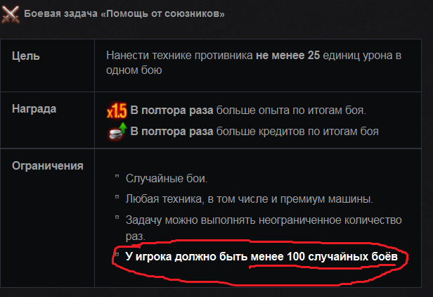 Почему в игре во вкладке Боевые задачи:Боевая задача "Помощь от союзников" написанно что должно быть не более 100 боёв, а на сайте Word of Tanks в этой же задаче написанно не менее 100 боёв!