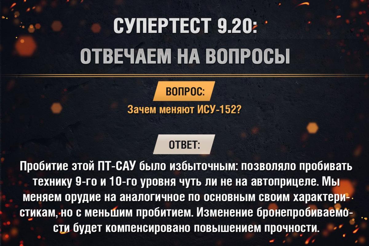Приветствую! В официальной группе World of Tanks вконтакте увидел новость https://vk.com/photo-9159189_456316828 http://cdn-frm-eu.wargaming.net/wot/ru/uploads/monthly_08_2017/post-26939143-0-52294100-1501747997_thumb.jpg В данной новости разработчики объясняют почему нерфят ИСУ-152, аргументация следующая - "Пробитие этой ПТ-САУ было избыточным...". Логично предположить, что другие ПТ-САУ 8ур, такие как UDES 03 и Strv S1, которые имеют больший пробой, также подлежат нерфу пронепробития. Возможно, компания Wargaming не про логику, тогда вопросов нет. P.S.: единственное, что было у ИСУ-152 это её альфа и пробой, в компенсацию нерфа накинуть ей 90хп - я лежу