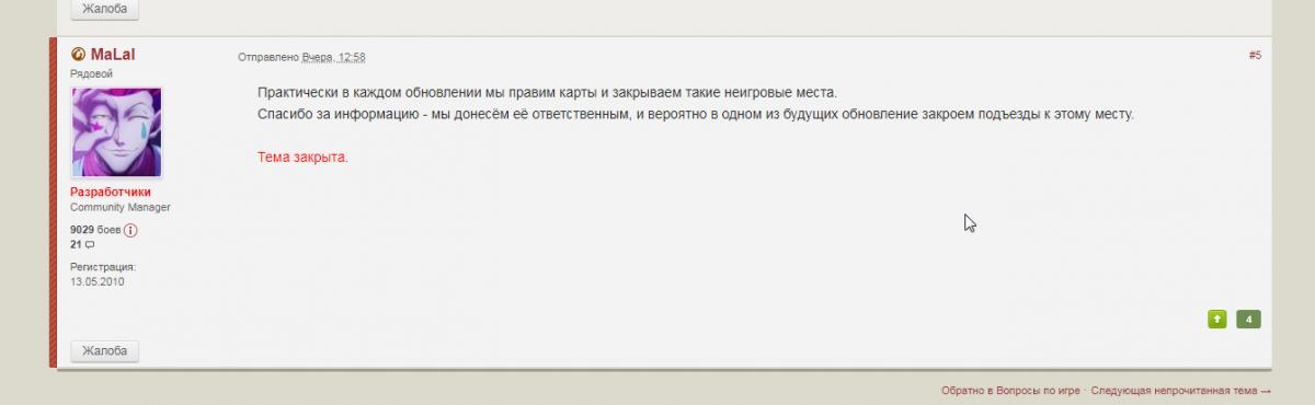 из разработчиков под ником MALal выдал этот пост http://cdn-frm-eu.wargaming.net/wot/ru/uploads/monthly_08_2018/post-27023729-0-51429300-1534887237_thumb.jpg и тут возник вопрос о игре - о не подарочных дней према ) а за реальные деньги игроков ??? (вопрос задан по ответу разработчика )) p&s - уточняю раньше думал что прем ак это что то одно но после этого ответа разраба что то стал сомневатся в том что его работа одинакова работает )) ну в специальный раздел я не лезу так обосновал его вопросом по игре а это для от дельной категории вопрос -- если кто то не понял что я хотел спросить --- покупной прем и подарочный чем то отделяется между собой ??? так как я не понял ответ разработчика который дал выроженное слова на именно подарочный прем ??? скрин в верху ))) P&S MALal - лично для меня это единственный на данный разраб который умеет --- обосновать -- пояснить --- четко -- без того тупизма который сейчас происходит на форуме !!! да и немного не понял ответ по багу (игровому процессу )) который есть тут на скрине !! а в чем то проблема ???это настараживает ваши ответы что вы так ответили --- а именно что вероятно что его в будущем в каком то патче ((может в 3.0 этот проезд закроют !!!а что трудно его закрыть в наступающем патче или планы на него нет??? http://cdn-frm-eu.wargaming.net/wot/ru/uploads/monthly_08_2018/post-27023729-0-40031100-1534889624_thumb.jpg http://cdn-frm-eu.wargaming.net/wot/ru/uploads/monthly_08_2018/post-27023729-0-31571300-1534889768_thumb.jpg http://forum.worldoftanks.ru/index.php?/topic/2002798-горные/