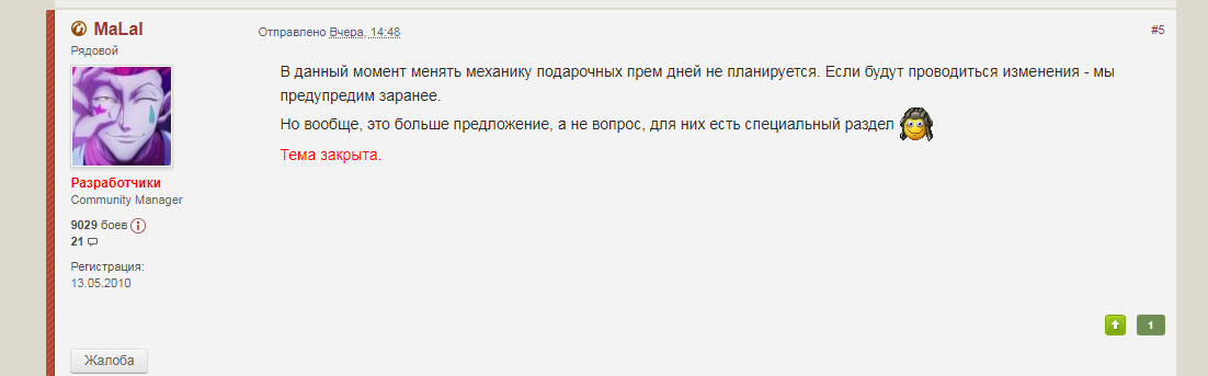 http://cdn-frm-eu.wargaming.net/4.5/style_images/wg/snapback.pngZloyBut (22 Авг 2018 - 01:27) писал: И это не верно. При получении подарочного прем-аккаунта вы НЕ МОЖЕТЕ выбрать время его активации здесь ошибка я могу выбрать время и минуты зайдя в игру при начисления премов за какие то события зайдя в игру в срок как вы там писали дальше!!! тема сути была не в этом если ты следишь за форумом прочти там ниже станиц через 4 (( обычно так троли отвечают так как отвечаете вы !!! НЕ ВНИКАЕТЕ В ТЕМУ НЕ ЧИТАЯ ДРУГИХ ПОСТОВ