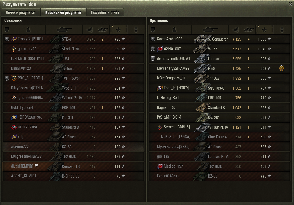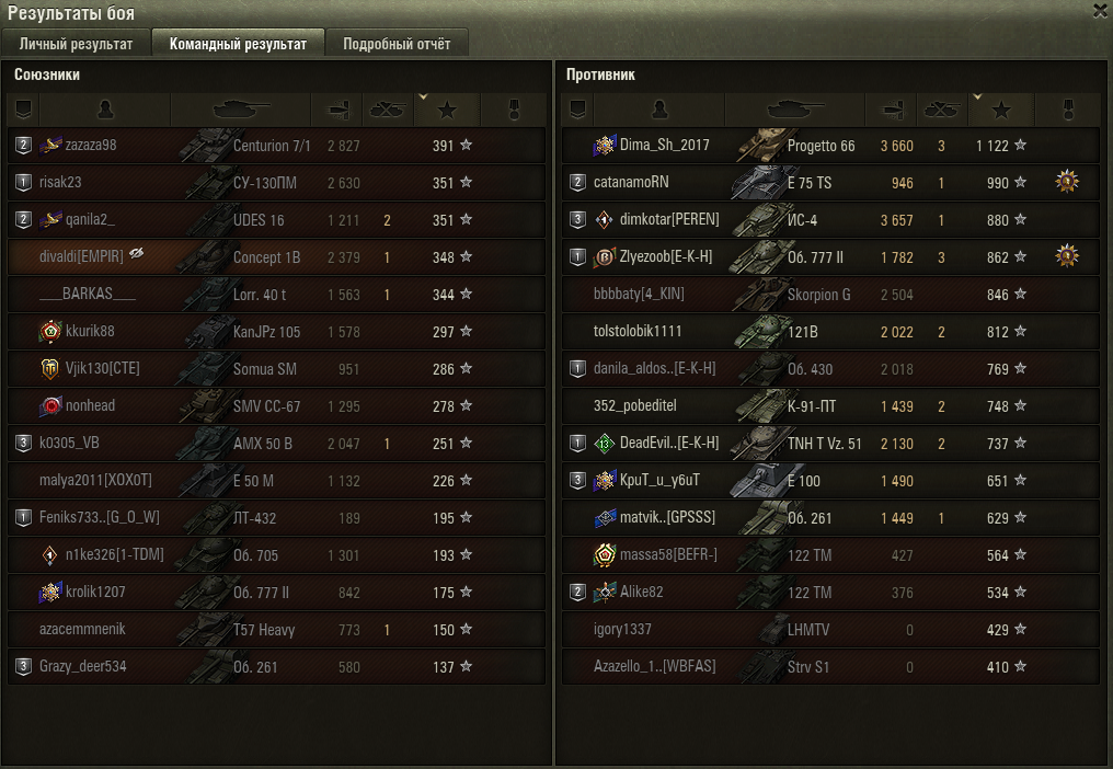 Разработчики, компания. раскажите до каких пор балансировщик будет строить команды не зеркально. я не имею в виду маус против мауса. я имею в виду что у одной команды есть 1-3 топ тяжа, в другой команде их на 0-2. на определенных картах наличие тяжа верхнего уровня это залог победы. Дальше. мы балансим елку против хвк30. это как в старые "добрые" панцервагон против колесника. колесника перестали балансить против панцервагона, но хвк30 так и попадает в бои, где ему говорят "лт, ***, свети", а водитель понмиает что он не пересветит елку. у меня хвк полностью заряжен исключительно в лт сетап и если елка просто стоит внутри куста- я пересвечу ее сильно позже того, как засвчусь сам. итого остается- смотреть как умирает моя команда в попытках "разминировать елку" в поле. Ладно, может на 8 уровне играет не так много лт и балансить елку просто нечем, бывает. хотя их много и можно балансить елку только елкой или другим маленкьим невидимым танком. Дальше. вот вышел из боя, где во вражеской команде в топе были вз55 и супер конь во взводе с леопард1. а в нашей команде было не 2 тяжа 10лвл, а 1. и это был таип 5 хэви. дисбаланс ощущается. Дальше. до этого был бой на фьордах(через бой это было), где в моей команде на 10 лвл были 57хэви и амх 50 б, танки слабо подходящие для игры на тт позиции фьордов тк брони во лбу у них практически нет. а их забалансило против супертяжей е100 и ис4. каковы шансы на победу у нашей команды в таком случае? каковы шансы на победу, если у тебя в команде 1 тяж 10 лвл, 3 тяжа 9 лвл и 1 тяж 8 лвл. а у противника 2тяжа 10 лвл, 2- 9лвл и 1-8 лвл? они однозначно есть, но не становятся ли они ниже? мантикора против шередана, гриль против е4. фв4005 против минотавра, стерва против 110е3. полная зеркальность в игре недостежима и преследовать ее = делать игру скучной, но есть базовые вещи, которые работали. а теперь вижу что перестали. Может человек, в этом разбирающийся, обьяснить почему так. в цпп написано что не всегда зеркально и взвода и так далее, но играя на 8 и 9 лвл я вижу сейчас очень часто что и без взводов это не работает и не так уж редко это бывает. ниже скрин боя с таип5 хэви. и с двумя супер тяжами против 50б и 57хэви. и прошу, не говорите что "вот, это потому, что они были во взводе, а про взвод мы сказали что не балансим". если так скажете, я буду скринить дисбалансные сетапы без взводов и кидать вам