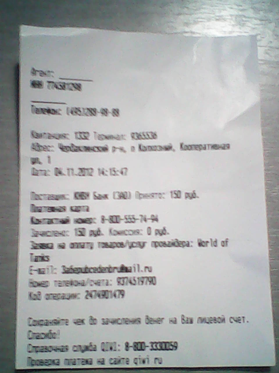 Кинул 150р. на игру ВоТ через терминал киви, прошло 2 часа до сих пор деньги не пришли, обычно приходили быстро. Зато на почту пришло вот такое сообщение: Это скорее всего не то, но вот чек оплаты