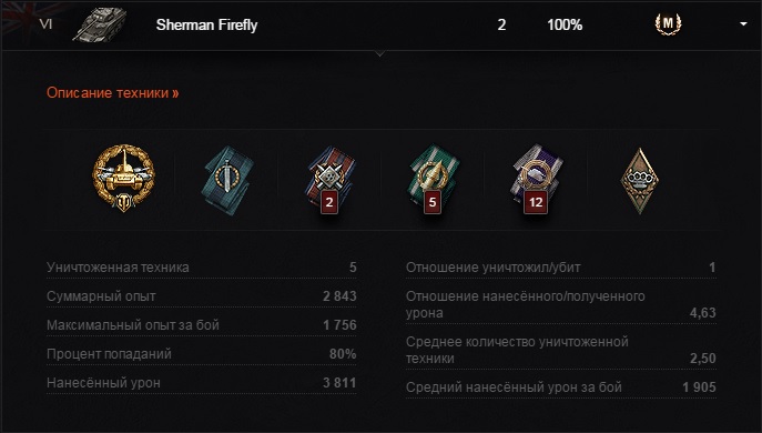 Случайно заглянул в статистику, глянуть на новое приобретение и заметил неточность: у меня на танке 5 фрагов и 0 смертей, а отображается что соотношение "уничтожил/убит": 1 http://cdn-frm-eu.wargaming.net/wot/ru/uploads/monthly_07_2015/post-2717474-0-38444900-1436543813_thumb.jpg В ссылках на реплеи в результатах боя можно убедится, что оба раза выжил: http://wotreplays.ru/site/5820802#skrytaya_derevnya-stogrammm-sherman_firefly http://wotreplays.ru/site/5820809#peschanaya_reka-stogrammm-sherman_firefly