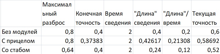 Без обид, но вы не поняли вопрос. И я вас осуждать не буду, а попробую разжевать. Возможно кто-то сильно шарит в математике и уже высчитал время сведения с разными модулями (как в своё время вычислили бесполезность приводов на фоне стаба). Дано: Максимальный разброс Х, конечная точность Y и скорость сведения Z (сокращение круга разброса вдвое). Ситуация номер раз (с прицелом): Т1 = (Х - 1,07*Y)/Z Позишн намбер ту (со стабом): Т2 = (0,8Х - Y)/Z Вопрос: Насколько Т1 больше, чем Т2? (или что вы там про имбирь и чеснок?) UPD. Вот попробовал прикинуть примерный расчёт при условных значениях точности 0.4, времени сведения 2с и максимального разброса 0.8 (м/100м). Я просто до конца не могу понять механику сведения и как её запихать в формулу, чтобы вычислить полное сведение. На скрине текущая точность, это точность после начала сведения с максимального разброса за время уменьшения круга вдвое.