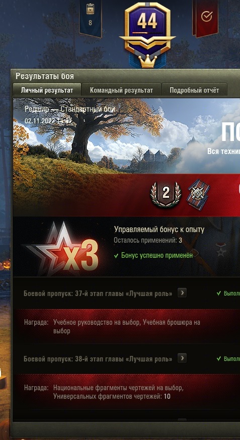 Последние несколько дней в результатах каждого боя стали отображаться несколько последних этапов боевого пропуска. У меня уже 44й этап, а отображаются все с 37го и не важно поднялся я на уровень или нет. Это баг или фича. Примерно в это время я купил задачи на БП с девушкой в комплекте. Может быть это как-то связано.