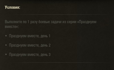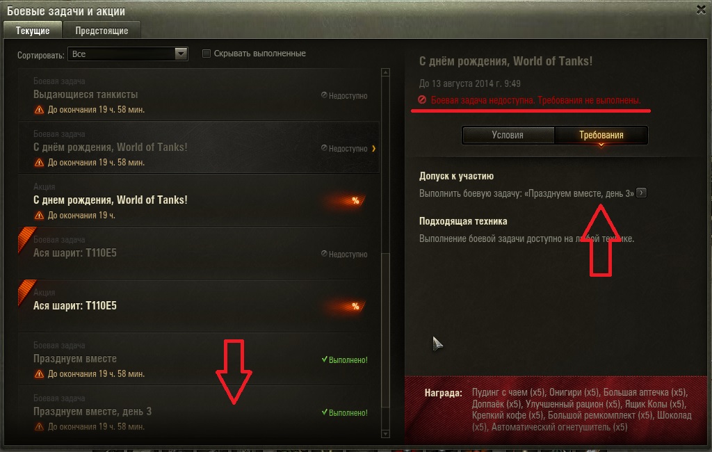 Всё равно я не понимаю. В условиях написано у всех одинаково http://cdn-frm-eu.wargaming.net/wot/ru/uploads/monthly_08_2014/post-2684205-0-70982600-1407840950_thumb.jpg А в требованиях насколько я понимаю - отображается именно то, чего не хватает для включения след. акции или задачи. Выше вкладок Условия и требования я подчеркнул. Написано что не выполнено требование, а не условие. А в требованиях написано про день 3 и никак по другому. http://cdn-frm-eu.wargaming.net/wot/ru/uploads/monthly_08_2014/post-2684205-0-59339200-1407841101_thumb.jpg Если бы я не выполнил день 1 или 2 - то там я так понимаю про них было бы написано