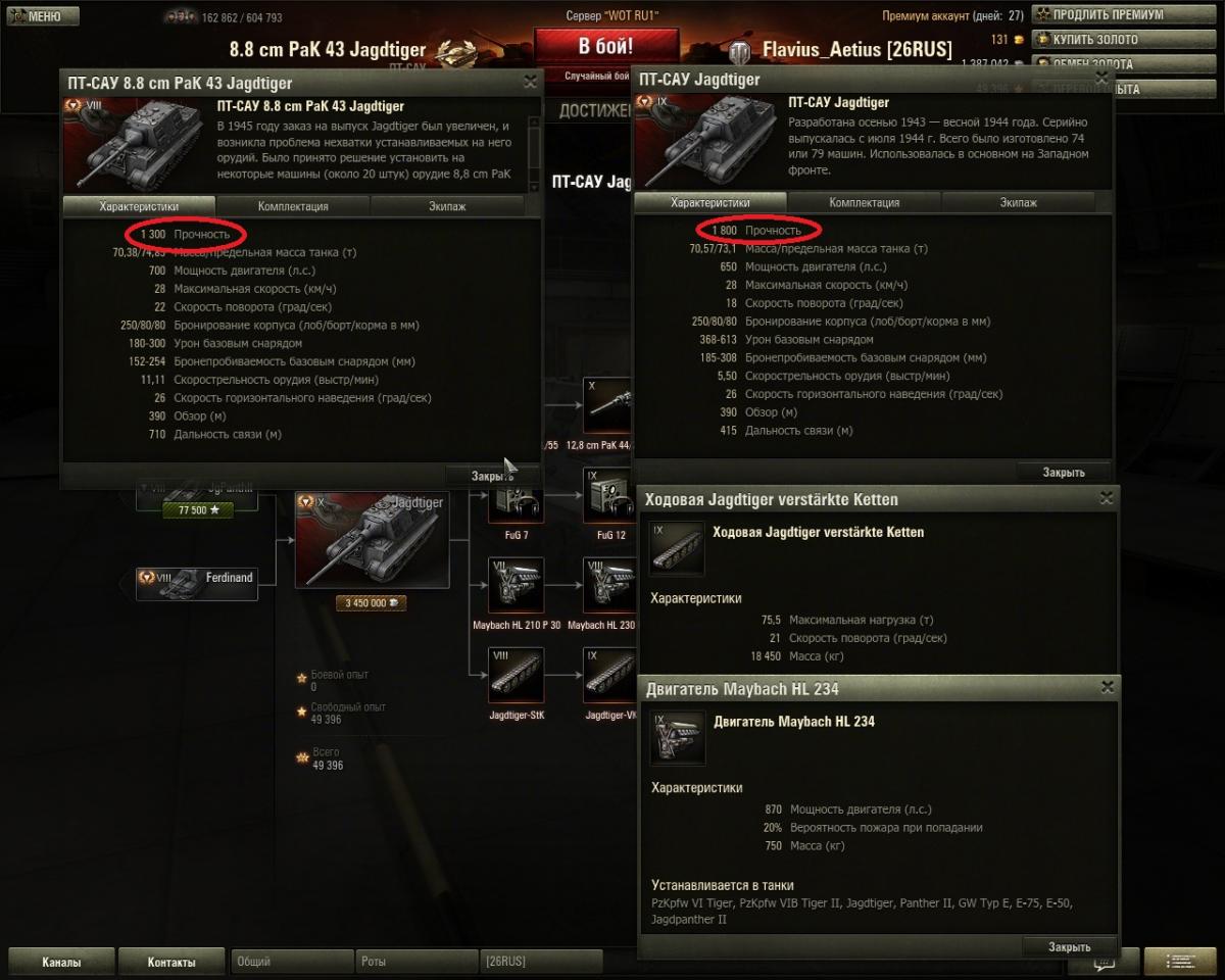 Здравствуйте, уважаемые читатели форума World of Tanks! Откатывая в игре сотни, тысячи и даже десятки тысяч боев, каждый из нас, так или иначе, сталкивался со многими игровыми вопросами, на которые хотел бы узнать ответ. Проведя в рандоме изрядное количество боев (через недельку-другую отпраздную свой юбилейный десятитысячный бой), я столкнулся с интересной для меня дилеммой, на которую я все-таки нашел ответ. Но хотелось бы узнать ваше мнение. Ближе к делу. В игре есть достаточное количество машин, которые в свою очередь очень сильно походят друг на друга. Покажу пример: французские пт с восьмого по десятый уровни (AC Mle.48, AMX50FOCH и AMX50F155 соответственно). Но есть и другая дивная парочка, привлекшая мое внимание. Это немецкие пт’шки Jagdtiger и Jagdtiger 8.8 cm. Ну что можно о них сказать? Абсолютно одинаковые корпуса, следствие и бронирование остается на одном уровне, равный вес, приблизительно, по 70 тонн. Думаю, нет особой надобности называть весь их перечень сходств. Да, безусловно, есть и отличия. Конечно же это их орудия, сюда же я отнесу и разные двигатели – разница небольшая, всего 170 л.с. в пользу обычного Jagdtiger’a. Но, обратите свое внимание на красные овалы на моем скриншоте. Точнее на те цифры. 1300 ед. прочности и 1800 ед. соответственно. Лично мне совсем не понятна эта разница в 500 единиц, когда она присутствует у идентичных машин. Чуть-чуть более мощный движок в совокупе с другим орудием никакой погоды не играют. Если все же задать банальный вопрос ‘’Почему так?”, то легко найти ответ: «Это же разные уровни! Поэтому и Варгейминг и сделал по балансу их именно такими.’’ Так или иначе я повторюсь и скажу, что лично для меня это все очень не логично. А что думаете вы по этому поводу?