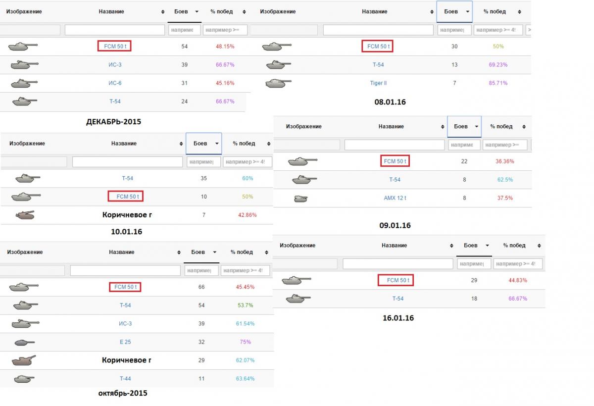Я не поленился. Выбрал самое характерное, где боев много было. Снизу под каждой табличкой даты. Засек один (!!) день, где за 10 боев было 80% побед на Фцм, но там всего ничего боев за день. Больше 55% в другие дни не видел. По всем танкам (арту за танк не считаю), где мелькают 45% в конкретный день - ситуация с общим % побед по танку со временем выправляется до 55-65%. Я как считаю, не хучшим образом играю, чтобы на танке была стабильно такая ситуация (хотя бы потому, что на других она кардинально отличается).