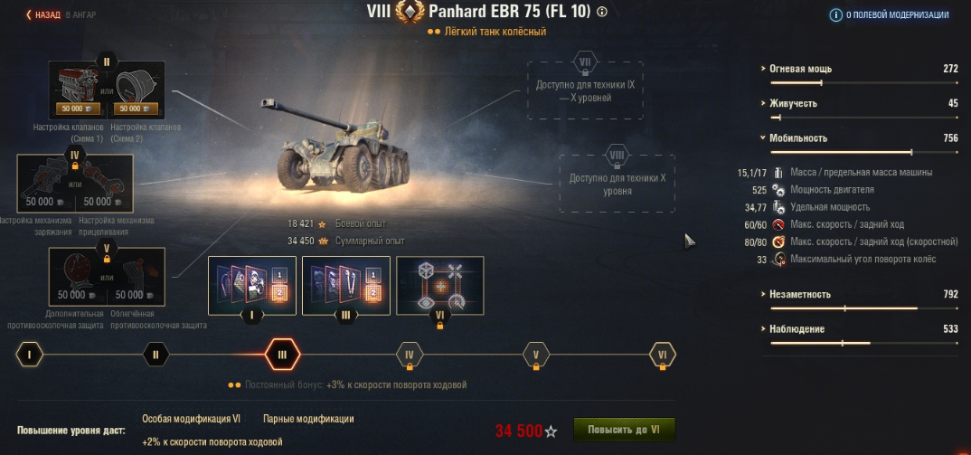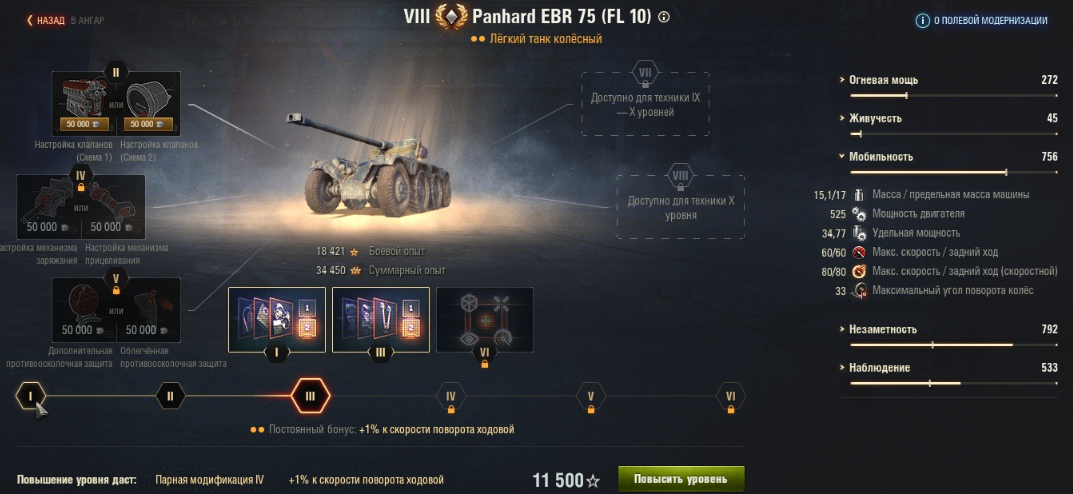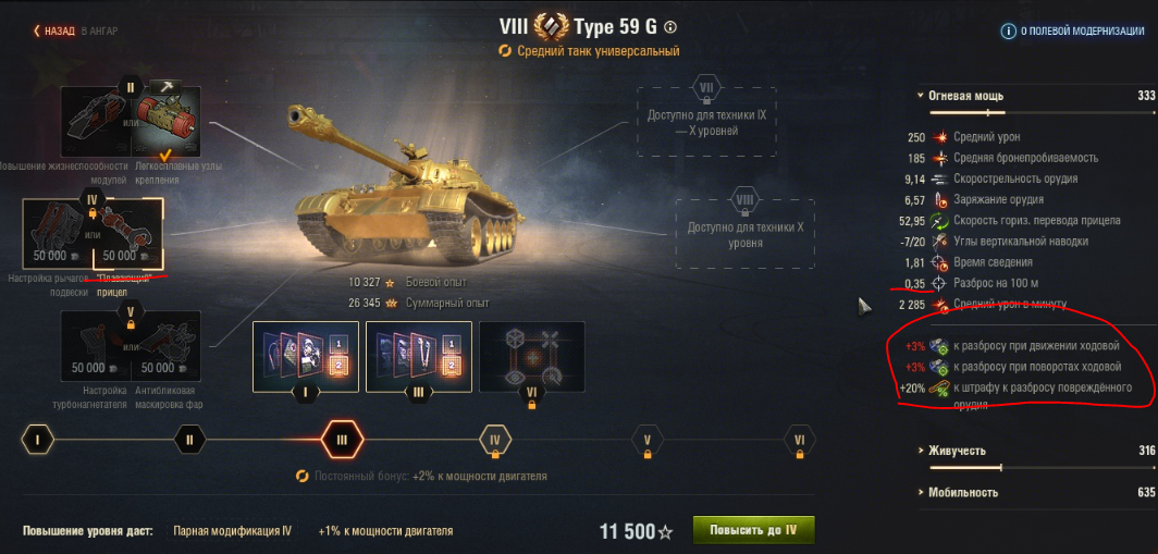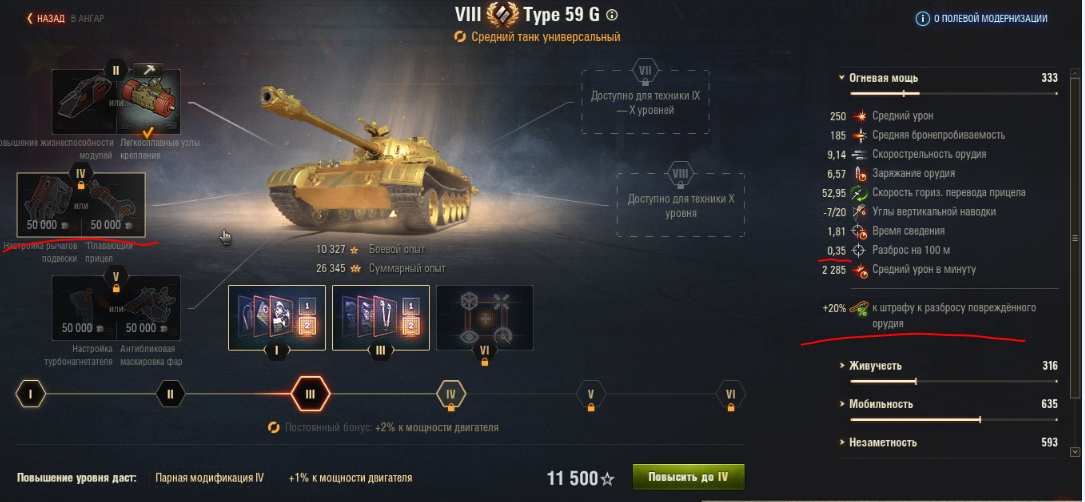 В ангаре имею 274а с аналогичным показателем разброса - 0,35. При включении модификации становится 0,34. В случае тайпа 59 ТТХ не просто не отображаются, а не изменяются. Это видно по шкале огневой мощи, она не изменилась даже на 1 единицу.