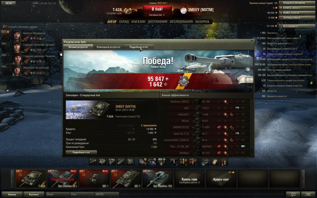 отличный танк, вот бой был только что 7022 дамага, но арта меня все таки достала в конце :) Победа! Бой: Заполярье 3 января 2013 г. 18:46:24 Танк: Т-62А Получено опыта: 1 642 Получено кредитов: 95 847 Достижения в бою: Медаль Паскуччи