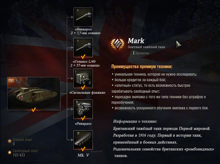 Первый тяжёлый танк I уровня в игре- первый танк в Мире. http://cdn-frm-eu.wargaming.net/wot/ru/uploads/monthly_01_2014/post-2816159-0-36662800-1390030538_thumb.jpg Никому не секрет, что добавление новой техники- это всегда огромное событие. И сейчас я хочу предложить не очередную "имбу" 10-го уровня, а c точностью наоборот. Хочу прикоснутся к частичке той истории, которую компания ,по возможности, сохраняет. Да, я понимаю, что из соображений соблюдения баланса не всегда удаёться привести технику к историческому виду, но отсутствие в игре про танки, собственно, самого первого Танка, меня огорчает. По этому хочу предложить на рассмотрение возможность добавления нового (и ,пока, единственного) премиумного тяжёлого танка первого уровня: Mark. Я намеренно не добавляю цифру после названия, т.к. щитаю что было-бы разумно собрать его из разных модификаций, например корпус взять от Mk.V , поискать двигатель более поздней модификации, что-бы довести скорость хотя-бы до приемлемых 8 км/ч. итд. Если будет такая возможность сделать выбор между пушечным(самец) и пулемётным(самка) вооружением.( Рис. 1) http://cdn-frm-eu.wargaming.net/wot/ru/uploads/monthly_01_2014/post-2816159-0-60712000-1390030699_thumb.jpg Теперь хочу затронуть , собственно, игровую составляющюю. Всё-таки наличие двух пушек осложняет геймплей, но я нашёл, как мне кажется, оптимальное решение. Смысл в том , что у танка будет два сектора обстрела, стоит перевести прицел влево, автоматически будет стрелять левая пушка, в право-правая.( Рис. 2)(Gif) http://cdn-frm-eu.wargaming.net/wot/ru/uploads/monthly_01_2014/post-2816159-0-70169100-1390030748_thumb.gif В снайперском прицеле, пусть будет возможно, перемещение только в одном секторе обстрела(как на пт). Иначе из-за наличия слепой зоны спереди, прицел будет перепрыгивать.( Рис. 3) http://cdn-frm-eu.wargaming.net/wot/ru/uploads/monthly_01_2014/post-2816159-0-53000500-1390030770_thumb.jpg Заряжанеи пушек отдельное, но боезапас общий. Думаю, оптимально сделать индикаторы снарядов на маркере прицела для правой и левой пушки соответственно( Рис. 4) http://cdn-frm-eu.wargaming.net/wot/ru/uploads/monthly_01_2014/post-2816159-0-37180400-1390030795_thumb.jpg В модули танка входят стандартно: гусли, движок, баки, боеукладка , радиостанция, приборы наблюдения, и 2 пушки (одна вместо башни) (Рис. 5) http://cdn-frm-eu.wargaming.net/wot/ru/uploads/monthly_01_2014/post-2816159-0-49515800-1390030812_thumb.jpg Так как экипаж ограничен 6-ю членами экипажа, думаю будет оптимален такой состав: Командир(радист), Мех-вод, Два наводчика и Два заряжающего. Да машина должна получится специфическая- большая, медленная, неповоротливая, именно по этому её и надо ввести как прем. (Не хочешь-не покупай). Но лично я-бы с удовольствием купил из-за её необычности, архаичного(в хорошем понимании этого слова) внешнего вида и конечно же ради истори. Подведём итог:Плюсы- -Огромное по меркам первого уровня количество прочности (~300xp) -Наличие двух пушек -Хорошая проходимость -Не плохое вооружение(?) -Большой боезапас -Льготный уровень боёв (Можно да-же ограничить вообще 1-м уровнем)Минусы- -Огромные размеры -Плохое бронирование (~6 мм.) -Плохая рация(?) -Плохой обзор(?) -Ужасная скорость -Не круговой и ограниченный сектор обстрела ... И если опыт будет удачным , можно будет ввести и другие танки подобного плана, например французский пехотный танк CA-1 Шнейдер, или немецкий тяжёлый танк A7V. Хотя скорее их можно будет отнести к САУ класса штурмовых орудий, нежели полноценными танками.
