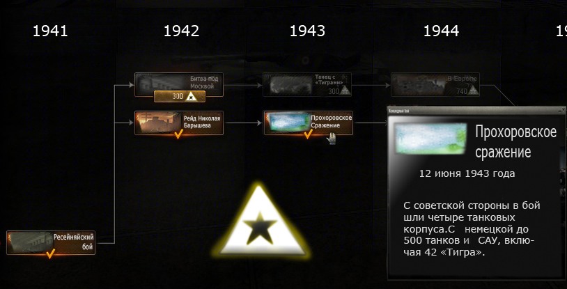 Вот ещё идеи, на оценку- Во первых было-бы интересно разделить бои на реально проходившие (исторические) и те которые могли бы быть , но по тем или иным причинам их небыло(Альтернативно исторические).(Рис 1) http://cdn-frm-eu.wargaming.net/wot/ru/uploads/monthly_04_2014/post-2816159-0-44024800-1397073382_thumb.jpg Если исторические бои будут захватывать, в основном, период 2 мировой войны и заканчиватся с падением Рейха, то в Альтернативной истории можно рассмотреть что было-бы если Война затянулась и некоторые образцы техники были-бы не только на бумаге и в единственных образцах, но и реально использовались в боевых действиях, например такие гиганты как Маус, Е-100 или Ис-7. Во вторых, открывая исторические/альтернативно исторические бои мы попадаем на дерево развития, на подобие того, что используется при прокачивании техники, но в данном случае надо открывать не танки и САУ ,а карты на которых проходили боевые действия. А разделены они будут не по уровням, а по годам .(Рис 2) http://cdn-frm-eu.wargaming.net/wot/ru/uploads/monthly_04_2014/post-2816159-0-14993400-1397073409_thumb.jpg За игру на карте ,например, 1943 года мы получаем опыт (Ну или как-то по другому назвать, вехи , например) который нужен для открытия карт 1944 года! Таким образом мы проходим все этапы боевых действий, последовательно открывая новые карты. Мне кажется это будет очень интересно! Конечно, хотелось-бы чтобы для этого режима были уникальные карты с неповторимым геймплеем(Например, минные поля или бункеры с мелко и крупноколиберными орудиями управляемые АИ, противотанковыми рвами итд.) Надеюсь что моя идея будет интересна и разнообразит этот режим!