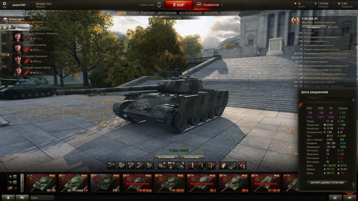 Танк по концепции аналогичен Берлинской тройке, ибо особой разницы с линейной 44-й нет, что есть большой плюс. Скатал 16 боёв, 8 в топе, 6 с девятками и пара боёв на дне. Дважды получил Мастера. Т44 в своё время проходил будучи полным нубом и постоянно плевался от неё, ибо играть вообще не получалось, сейчас же, в лице Т44-100, понимаю, что это очень интересный аппарат, предлагающий динамичный геймплей. Вертится прекрасно, едет хорошо, бронёй что-то отбивает, к тому же низкий силует и отличная маскировка. По пушке тоже особых претензий нет, стабилизация порадовала, снаряды чаще всего попадают куда надо, плюс поиграв на WZ-120 понимаешь, что она тут ещё и отлично гнётся. Фармится не шибко много, ибо частенько заряжал подкалиберы, на ББ же фарм как на типичном преме 8 лвл. За настрел 4к с использованием нескольких подкалиберов дали почти 90 тысяч. В итоге и играть интересно, и экипаж качается быстрее, плюс по 40-50 тысяч в среднем с боя в копилку. А ещё моделька очень красивая и камуфляжи покупать не надо