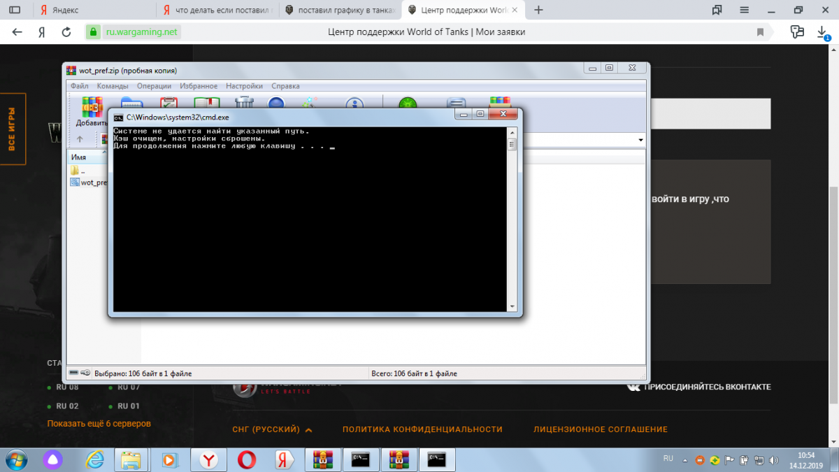 http://cdn-frm-eu.wargaming.net/4.5/style_images/wg/snapback.pngkoljan_86 (14 дек 2019 - 07:42) писал: Попробуйте очистить кэш игры. Для этого надо сделать следующее: Закройте клиент игры Скачайте архив Разархивируйте его и запустите bat-файл от имени Администратора ( для этого нажмите на файл правой клавишей мыши и из выпадающего списка выберите "Запуск от имени администратора" )Внимание! Настройки клиента игры а так же логин и пароль в соответствующих полях при включенном автозаполнении будут сброшены! Убедитесь, что Вы сохранили и знаете логин и пароль, во избежание проблем с авторизацией и входом в игру. О результате отпишитесь. http://cdn-frm-eu.wargaming.net/4.5/style_images/wg/snapback.pngkoljan_86 (14 дек 2019 - 07:42) писал: Попробуйте очистить кэш игры. Для этого надо сделать следующее: Закройте клиент игры Скачайте архив Разархивируйте его и запустите bat-файл от имени Администратора ( для этого нажмите на файл правой клавишей мыши и из выпадающего списка выберите "Запуск от имени администратора" )Внимание! Настройки клиента игры а так же логин и пароль в соответствующих полях при включенном автозаполнении будут сброшены! Убедитесь, что Вы сохранили и знаете логин и пароль, во избежание проблем с авторизацией и входом в игру. О результате отпишитесь.