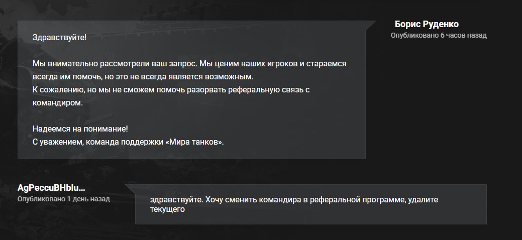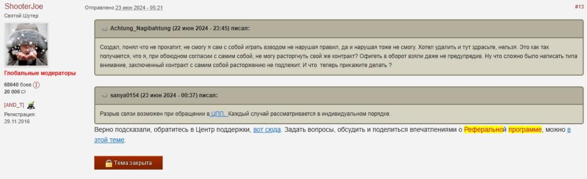 Здравствуйте. Как в вашей нашей прекрасной игре расторгнуть контракт с командиром в рефералке? Модератор ваш говорит, еще в 2024 году, пиши в ЦПП. https://forum-mt-prod.lesta.ru/monthly_07_2025/post-2940547-0-58365900-1753204989_thumb.jpg Я написал, но ответ был мы никак не можем. https://forum-mt-prod.lesta.ru/monthly_07_2025/post-2940547-0-29688700-1753205141_thumb.jpg Хороший тамада, че тут скажешь... Почему нельзя было сделать как раньше, чтоб можно кнопочкой расторгнуть?