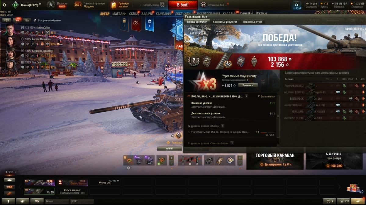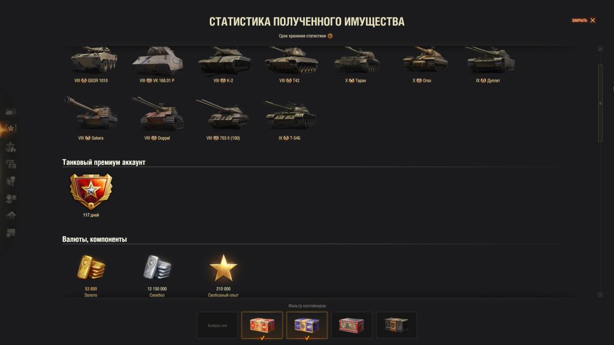 Вот такой результат получился за две недели неспешных покупок. Коробок куплено на 6000 рублей + почти все ежедневные коробки за золото, выпавшее с этих же коробок. Ещё 4 коробки выпало с автомата. Все танки первого этапа и два со второго + все стили. Хочется firebird, конечно, выбить, но до него ещё 140 коробок гарантами (