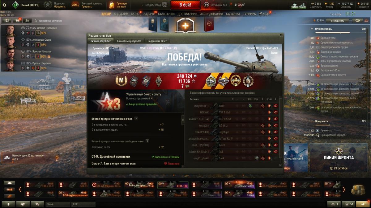 Хороший танк, поиграл на нём с удовольствием. Да, не хватает скорости, но к этому привык быстро. Играл на двух комплектах оборудования: 1. Боновые досыл, стаб, вентиль + инструкция на вентилятор 2. Боновая оптика, Командирский обзорный прибор, боновый вентилятор + инструкция на оптику. Успел 3 отметки взять до апа, пока статисты планку не задрали))0