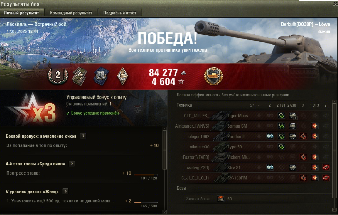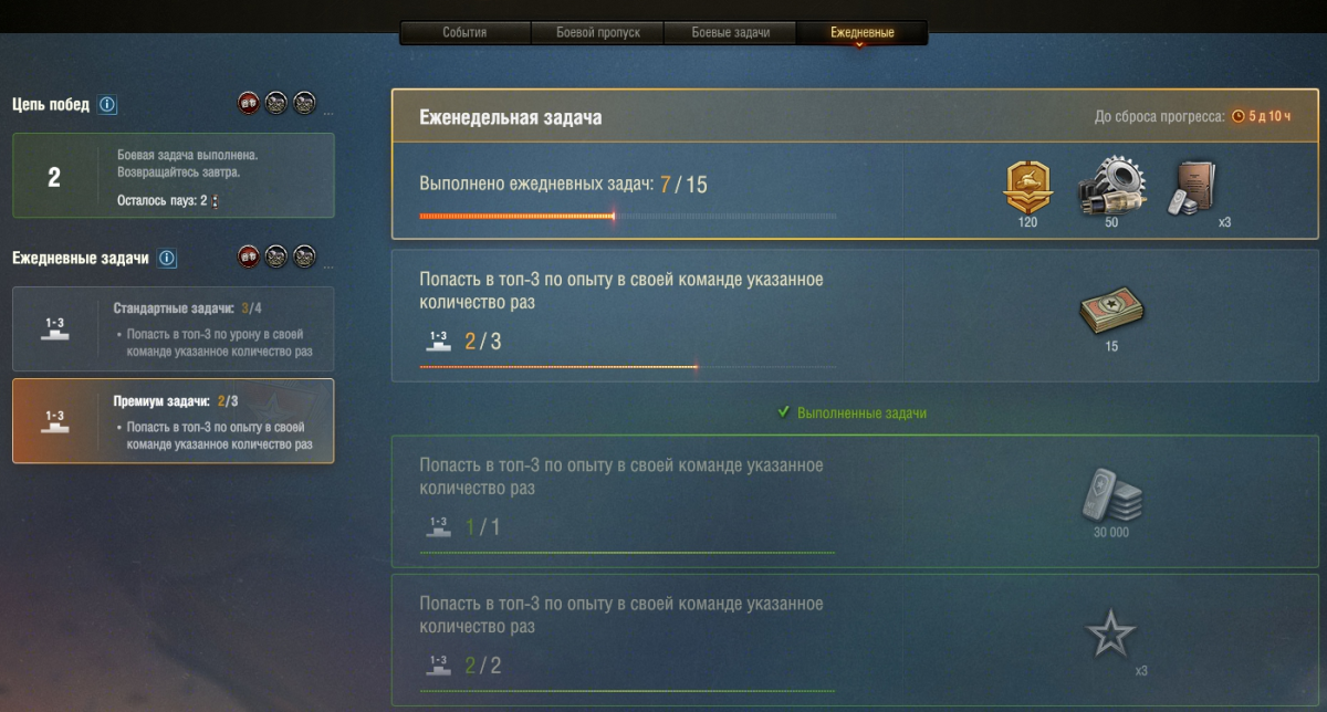 2. День добрый. По результату боя я получил одинаковый опыт с игроком из свой команды. В "Командном результате" по списку я на четвёртом месте, второй игрок на третьем. В "Боевом пропуске" за попадание в топ по опыту я получил 10 очков. Значит я занял третье место по опыту. В ежедневных "Премиум задачах" мне необходимо попасть в топ 3 по опыту, чтобы выполнить её. После этого боя я не выполнил "Премиум задачу". Значит я не занял третье место по опыту. Вопросы: Какое место я занял? В разных событиях разные правила? Я что-то упустил из виду? Просветите.